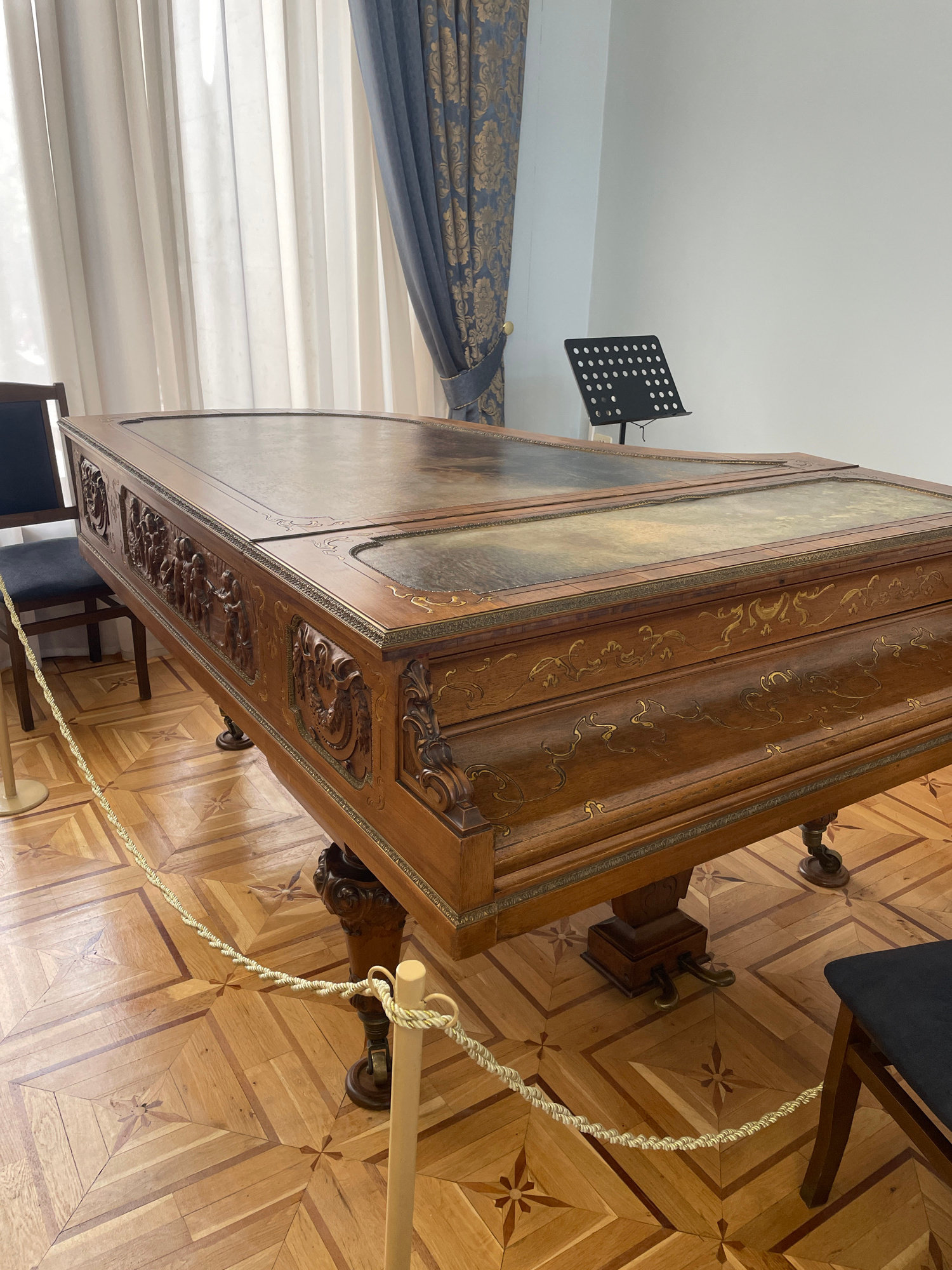 The image shows a large, ornately decorated wooden table in a room with parquet flooring. The table features intricate carvings and gold detailing. A music stand is visible near a window with blue cur…read more