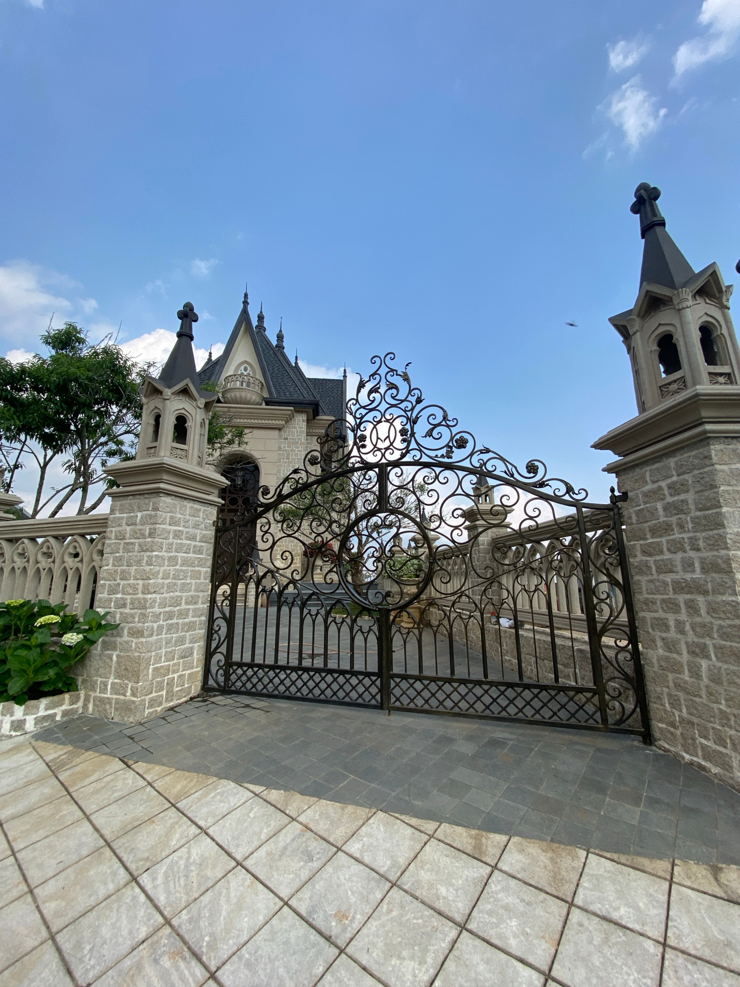Exterior shot of the Domaine de Marie Church gate. The gate is made of dark metal and has ornate designs. The building behind the gate is constructed from light gray brick. There is a gray and white sā¦read more