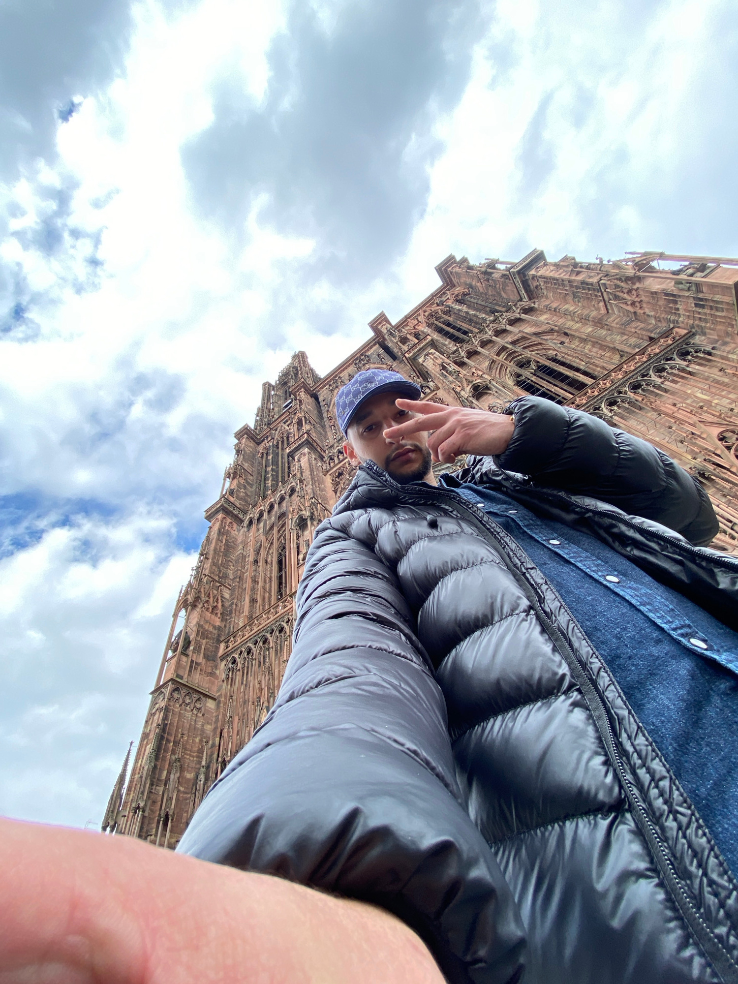 A low-angle, eye-level perspective shows a person in the foreground, wearing a black puffer jacket over a denim shirt and a blue paisley-patterned bandana. The person is flashing a peace sign. The bac…read more