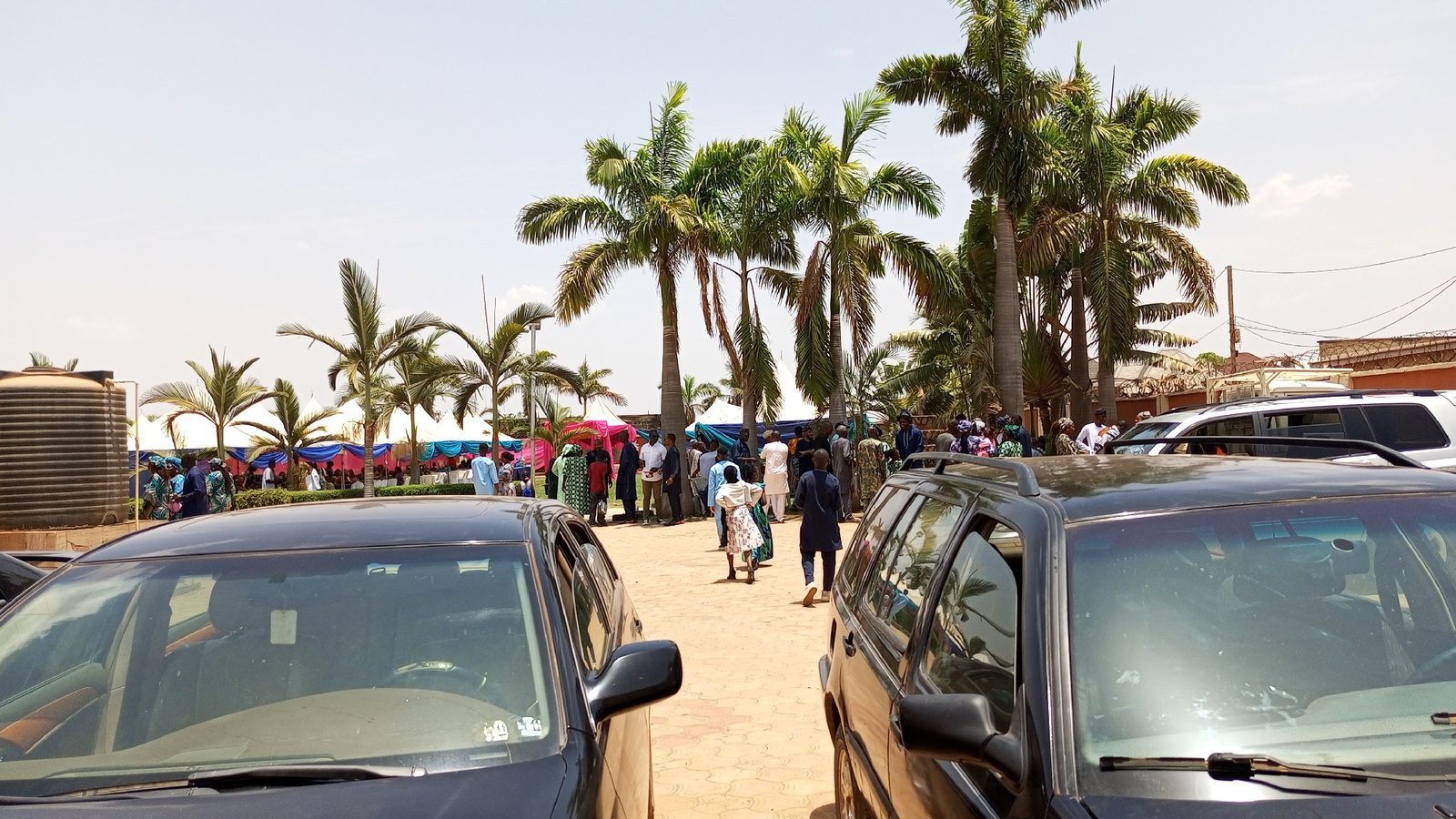 The image, taken during daylight hours in Kakau, Nigeria, shows an outdoor event possibly a wedding or a festival due to the presence of palm trees and blue and pink canopies in the background. Two da…read more