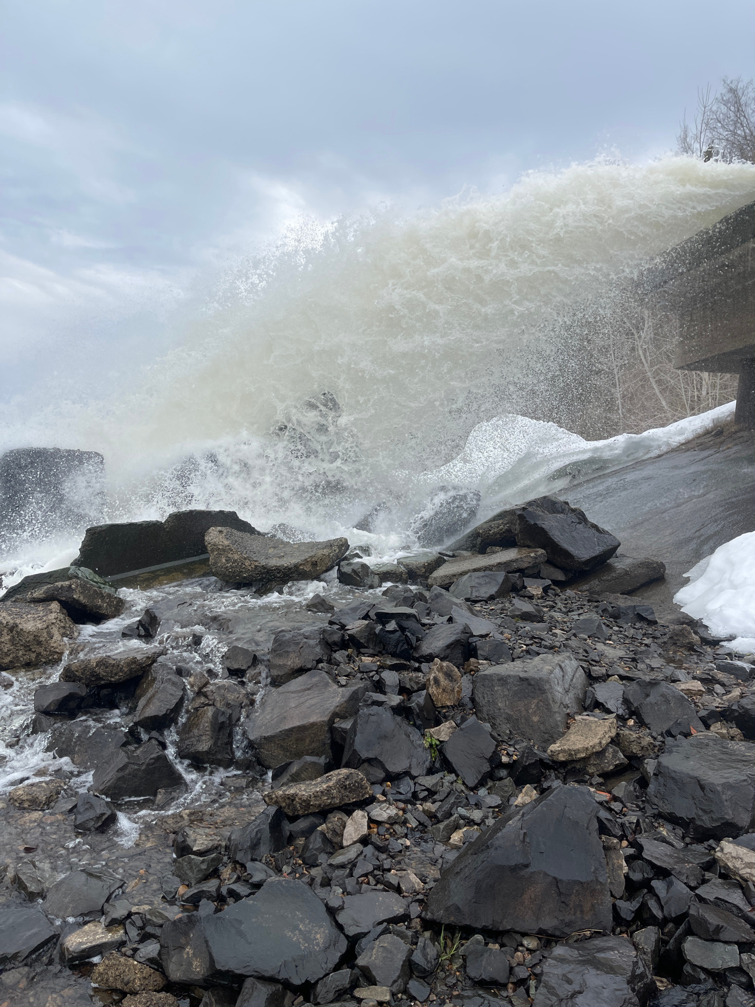 The image captures a waterfall adjacent to dark, wet rocks. The water appears opaque and white, possibly due to high turbulence or sediment. On the right side of the image, the rocky terrain is eviden…read more