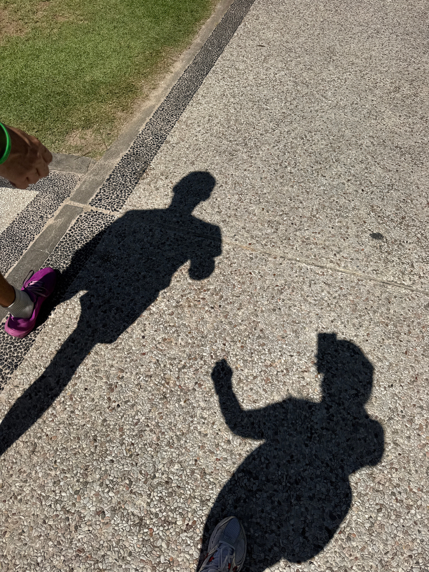 The image shows two shadows cast on a textured concrete surface, likely a pathway. One shadow appears to be of a person holding something above their head, with a foot visible in a grey and white runn…read more