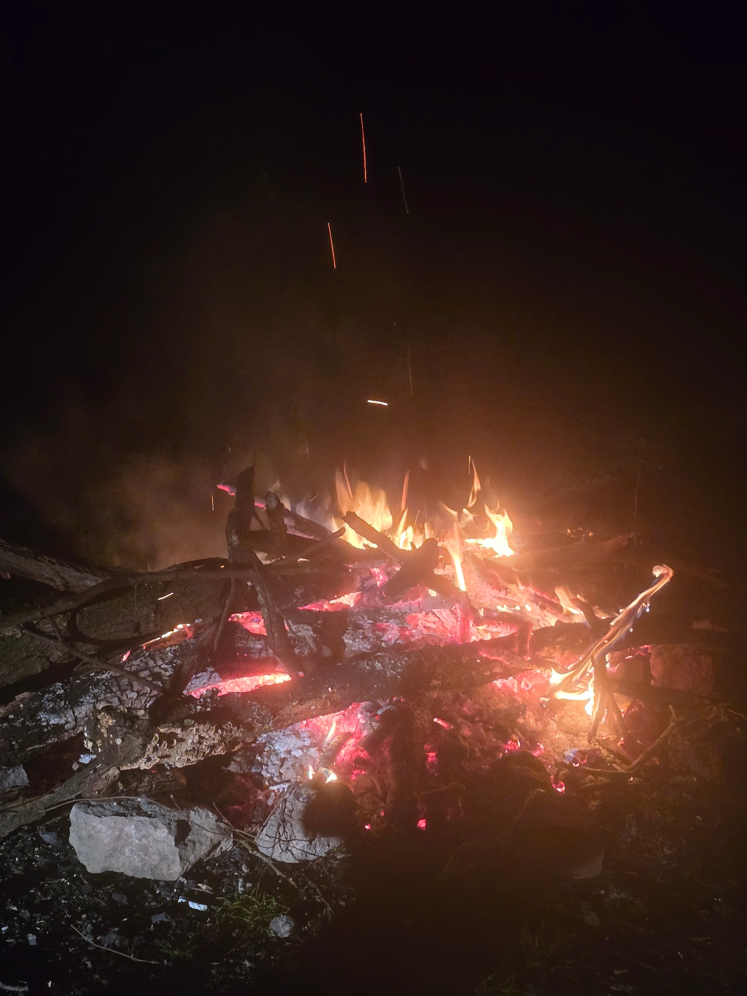 The image shows a bonfire burning at night. The fire is built from tree branches and logs, and it is burning intensely. The flames are orange and red, and they illuminate the surrounding area. Sparks…read more