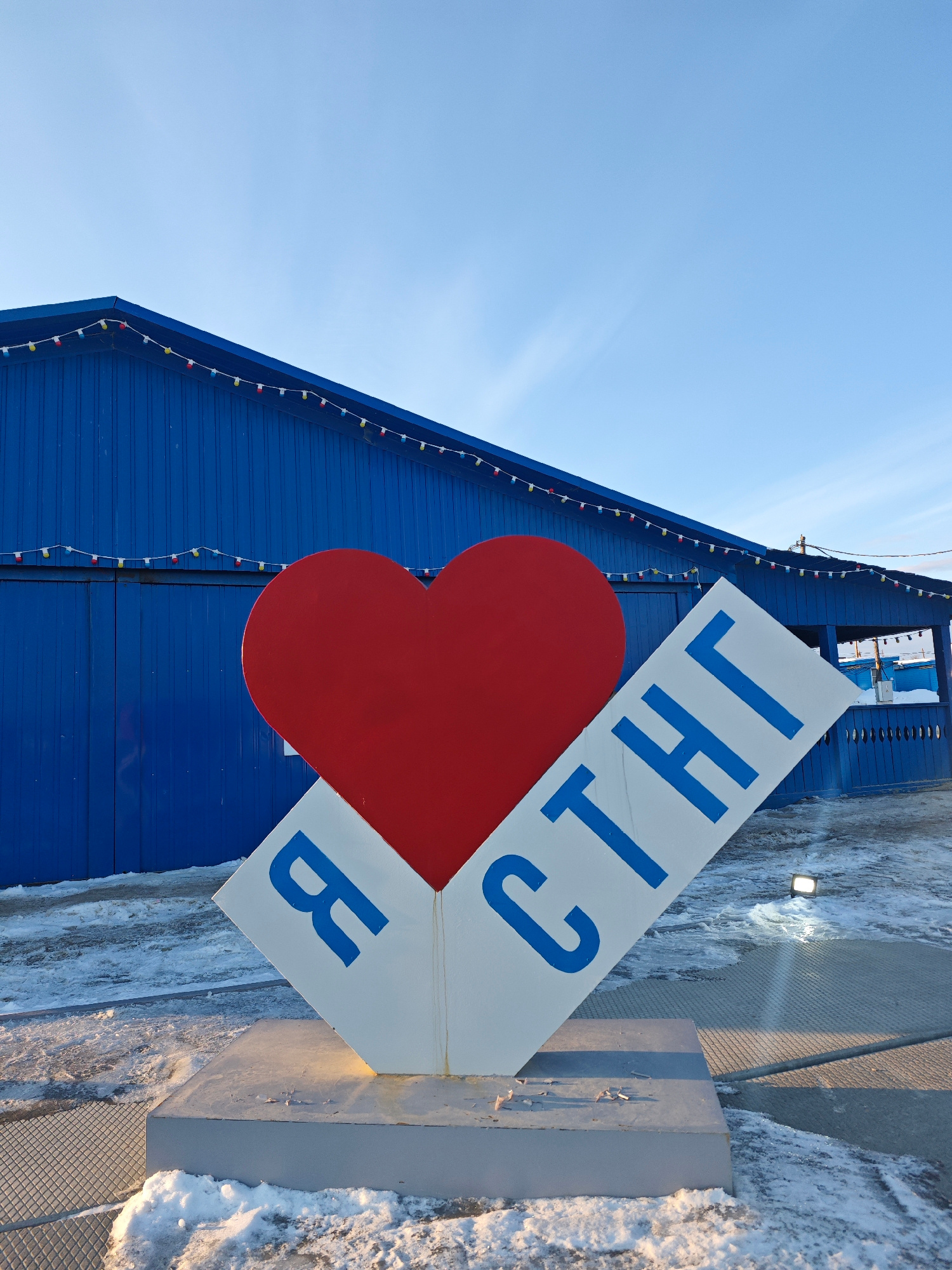 A ground-level, eye-level full shot shows a monument in the city of Strezhevoy, Russia that contains a red heart and blue Cyrillic text against a backdrop of a blue building with lights strung along i…read more