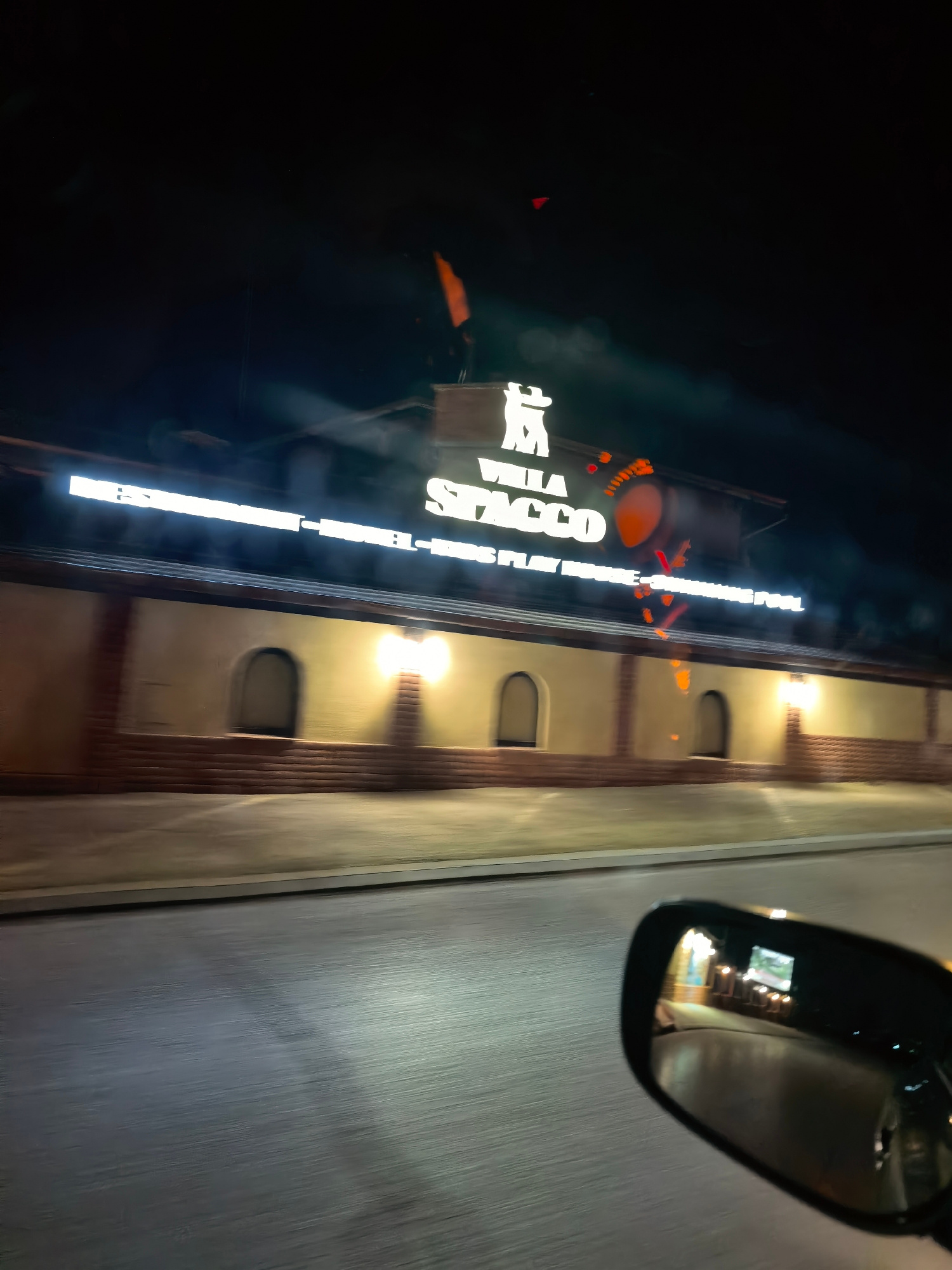 At night in an urban environment, a building with illuminated signage reading "Villa Stacco" and "Play House - Swimming Pool" is visible. The building has arched windows or doorways and is illuminated…read more