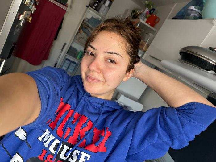 A frontal selfie captures a young adult individual, likely female, in an indoor residence in Schiltigheim, France. The individual has medium-length brown hair, pulled back, and is looking directly at…read more