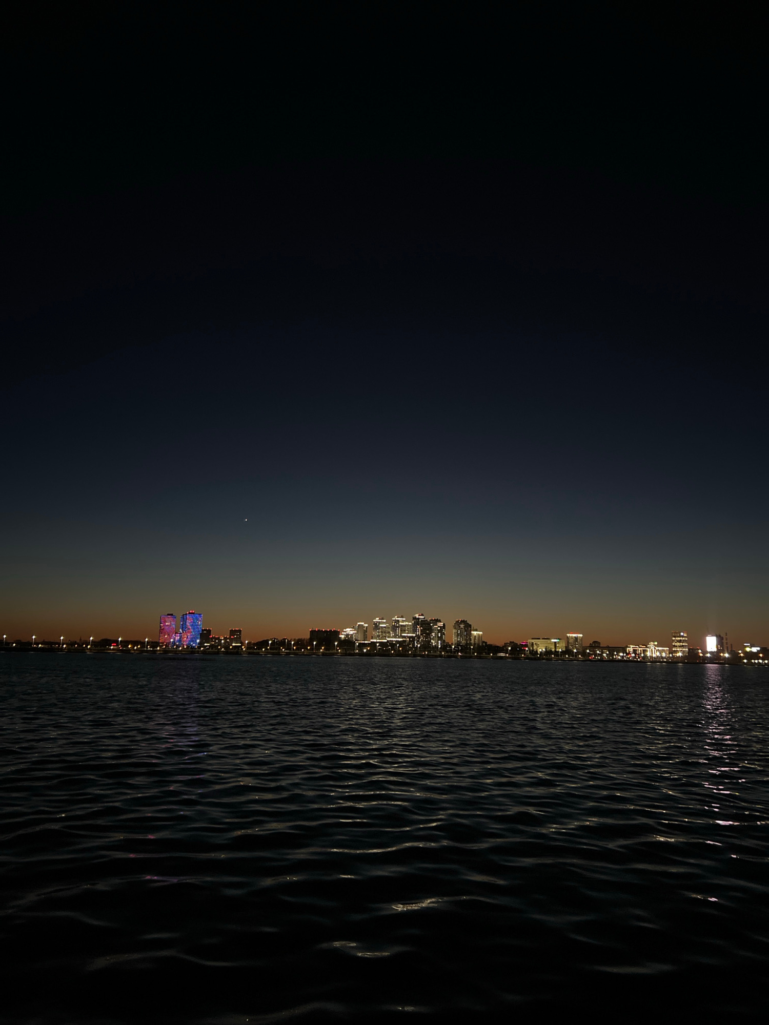 The image depicts a nighttime view of Kazan, Russia from across a body of water, likely the Volga or Kazanka River. The skyline is visible with building lights illuminating the cityscape. The water in…read more