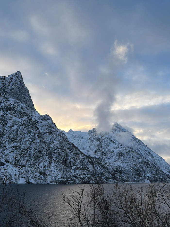 The image presents a panoramic view of a natural winter landscape in Laupstad, Norway. In the background, snow-covered mountains with rugged rock faces dominate the scene. A sharp, prominent peak is s…read more