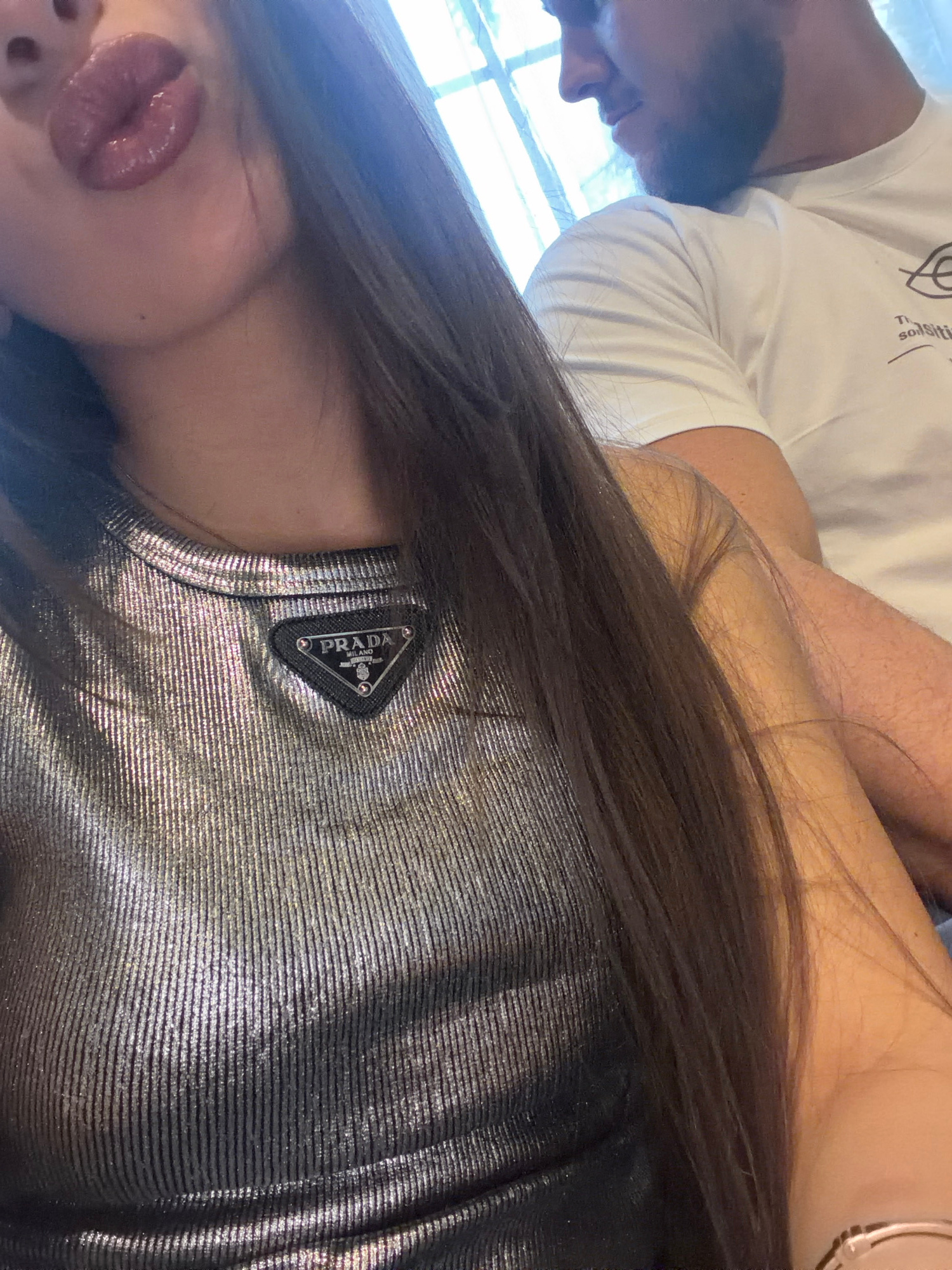 A close-up, tilted shot shows a woman with long, dark hair wearing a silver top with a Prada logo. Adjacent to her, a man with a beard wears a white t-shirt. The setting appears to be indoors, possibl…read more