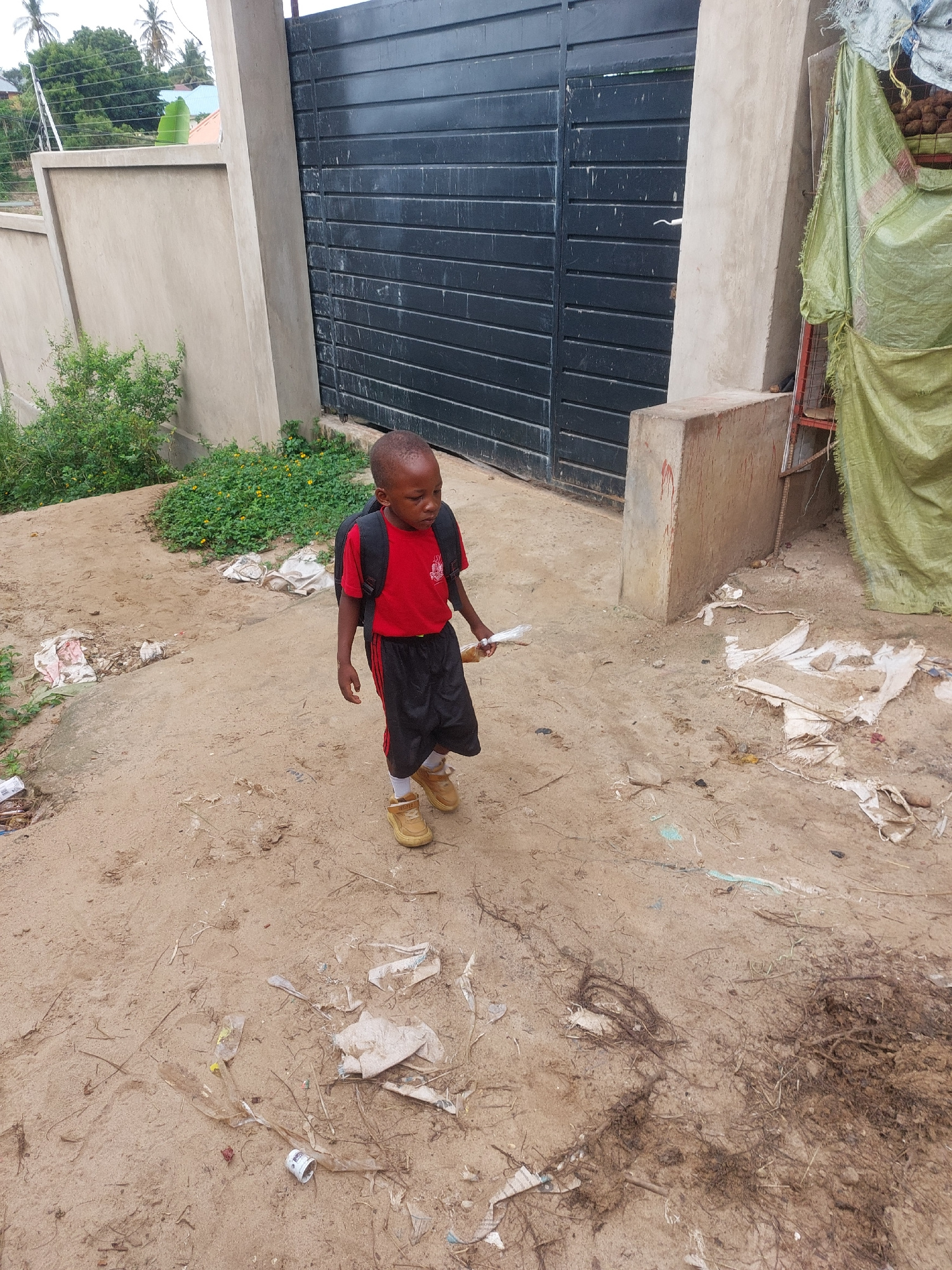 The image depicts a child in a red shirt, black shorts, and tan shoes standing on a dirt ground with scattered debris. A gate and part of a building or wall are visible to the left, alongside some gre…read more