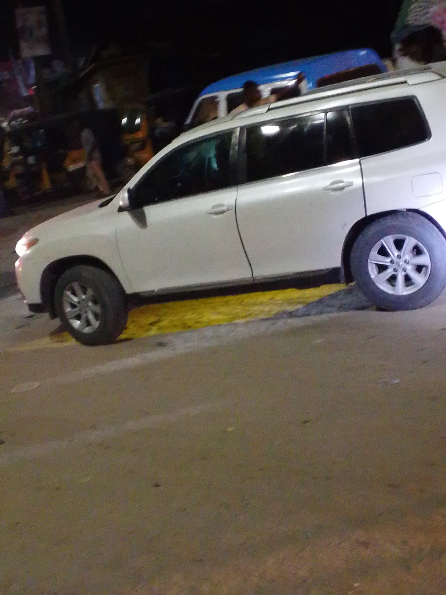 The image shows a white Toyota Highlander SUV parked on a street in Lagos, Nigeria at night. The SUV is parked on a section of yellow painted pavement. Other vehicles, including a blue and white bus a…read more