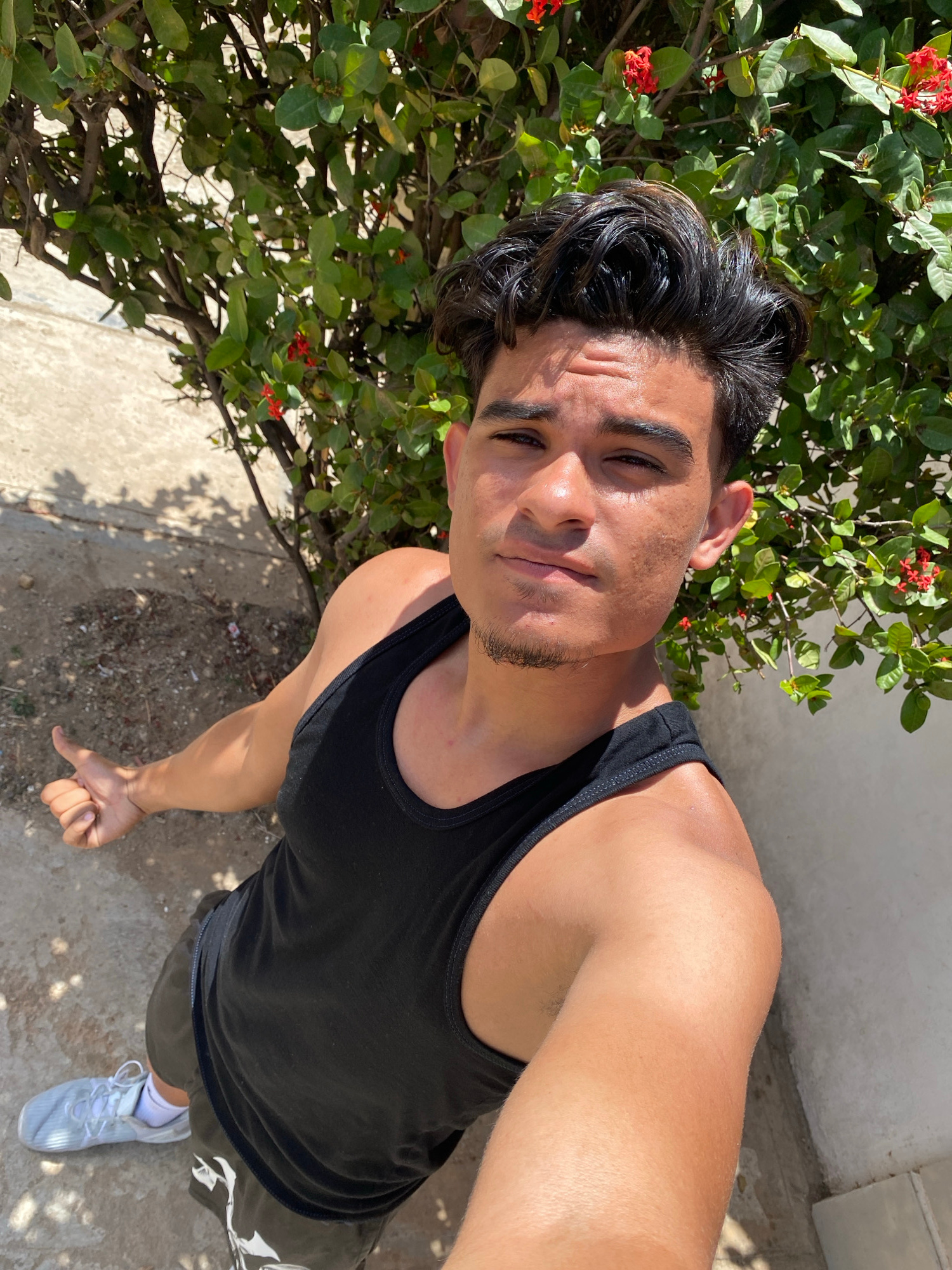 A medium-shot, high-angle photograph shows a light-skinned, dark-haired male wearing a black tank top and dark shorts in an outdoor setting. The man is positioned near a flowering bush with green leav…read more