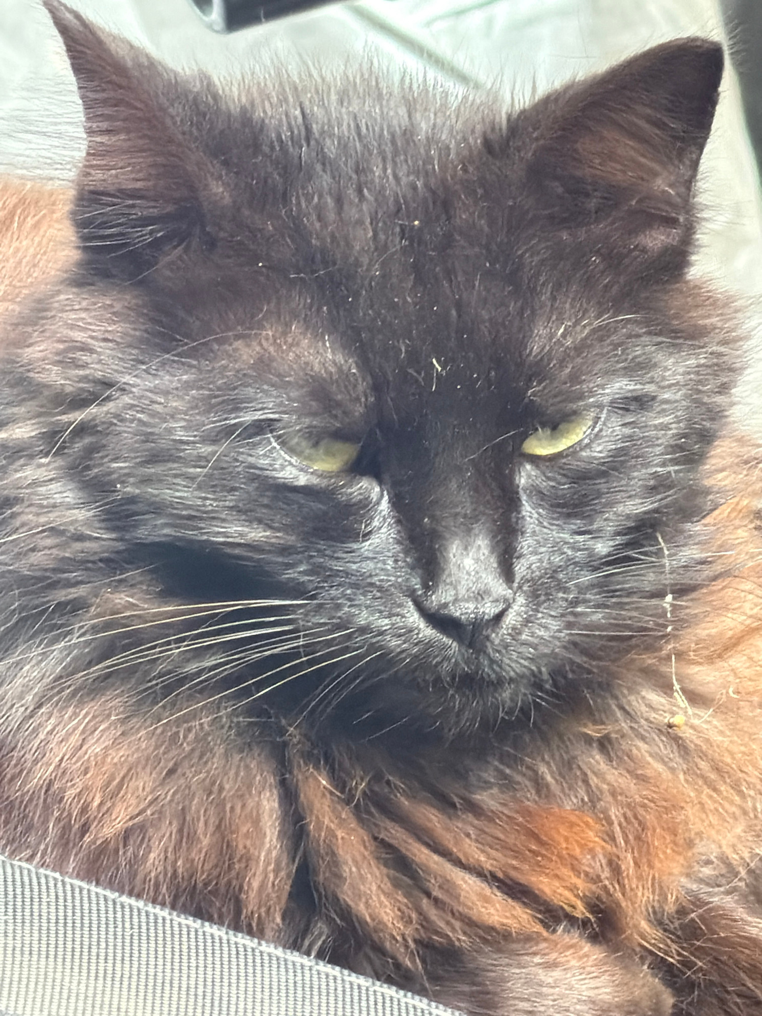The image shows a close-up of a black cat with long fur and yellowish-green eyes. The cat is lying down, with its face angled towards the camera. The cat's fur appears to have some brown highlights. T…read more