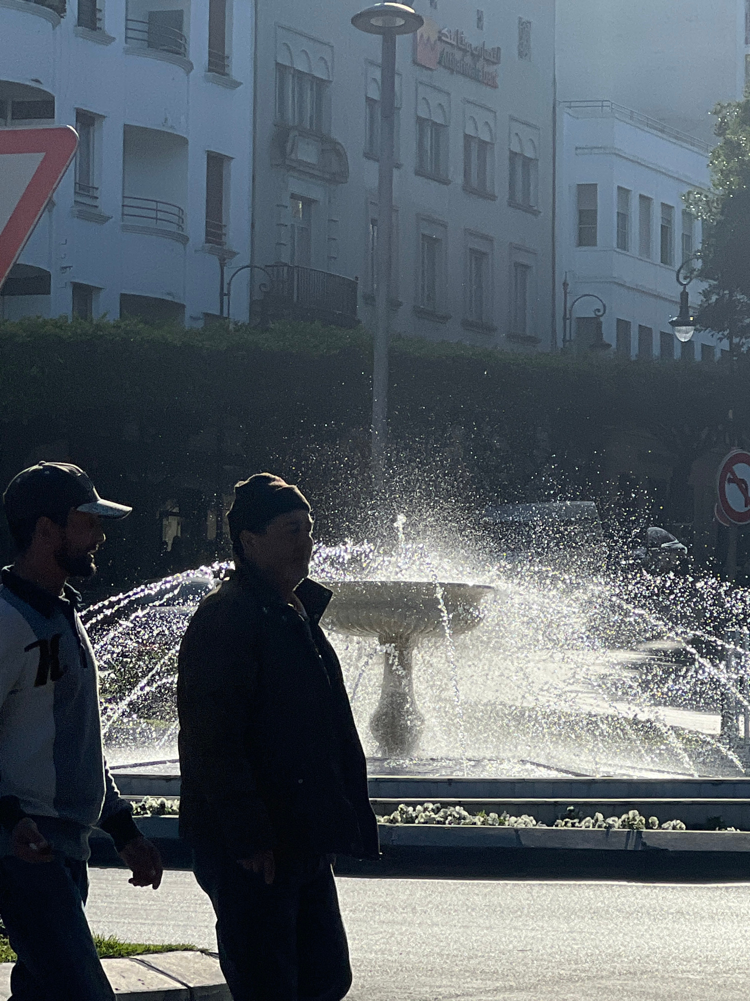 This image captures a brightly backlit street scene in Tanger, Morocco, specifically on or near Boulevard Pasteur, identifiable by the visible "بنك المغرب" (Bank Al-Maghrib) building in the background…read more