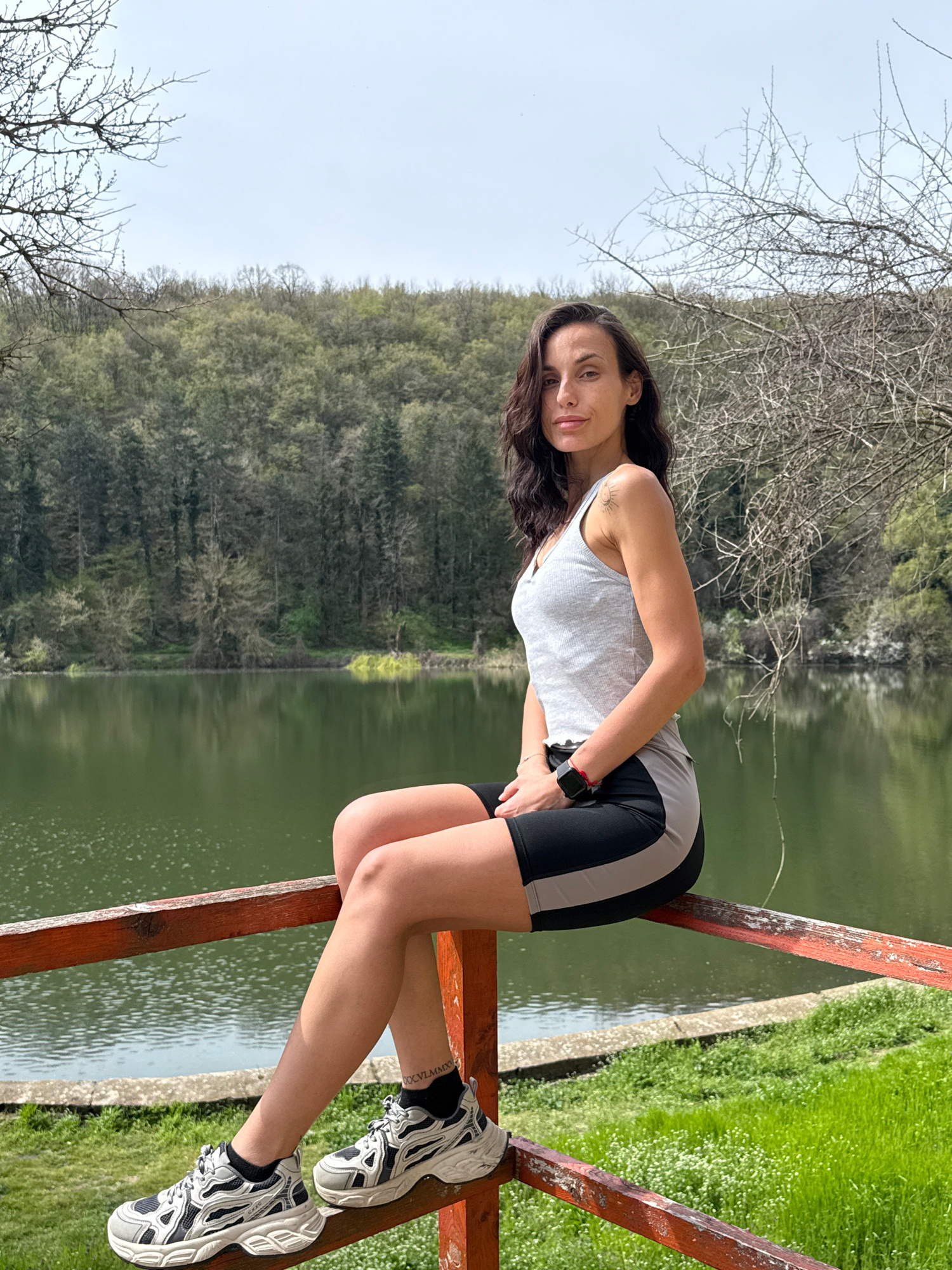 A woman is posing on a red wooden structure, possibly a bridge, overlooking a body of water in Pleven, Bulgaria. She is wearing a light gray tank top, black and gray shorts, and white and black sneake…read more