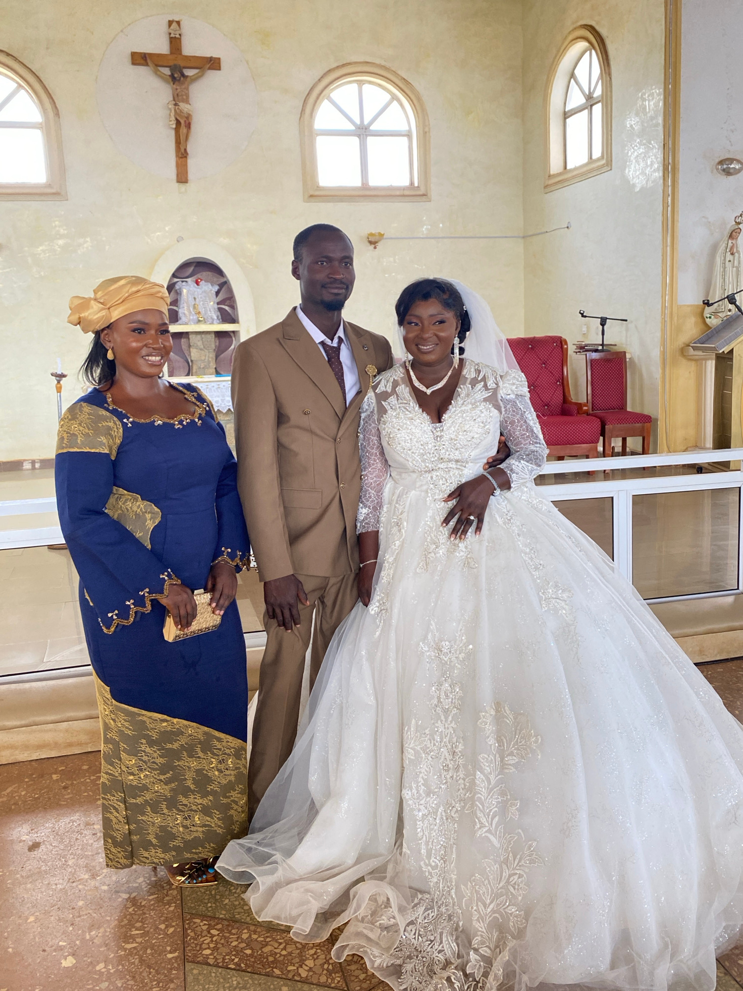 Three people stand for a photograph in what appears to be a church in Kuru Karama, Nigeria. On the right, a woman in a sparkling white wedding gown with long lace sleeves, a veil, and jewelry poses w…read more