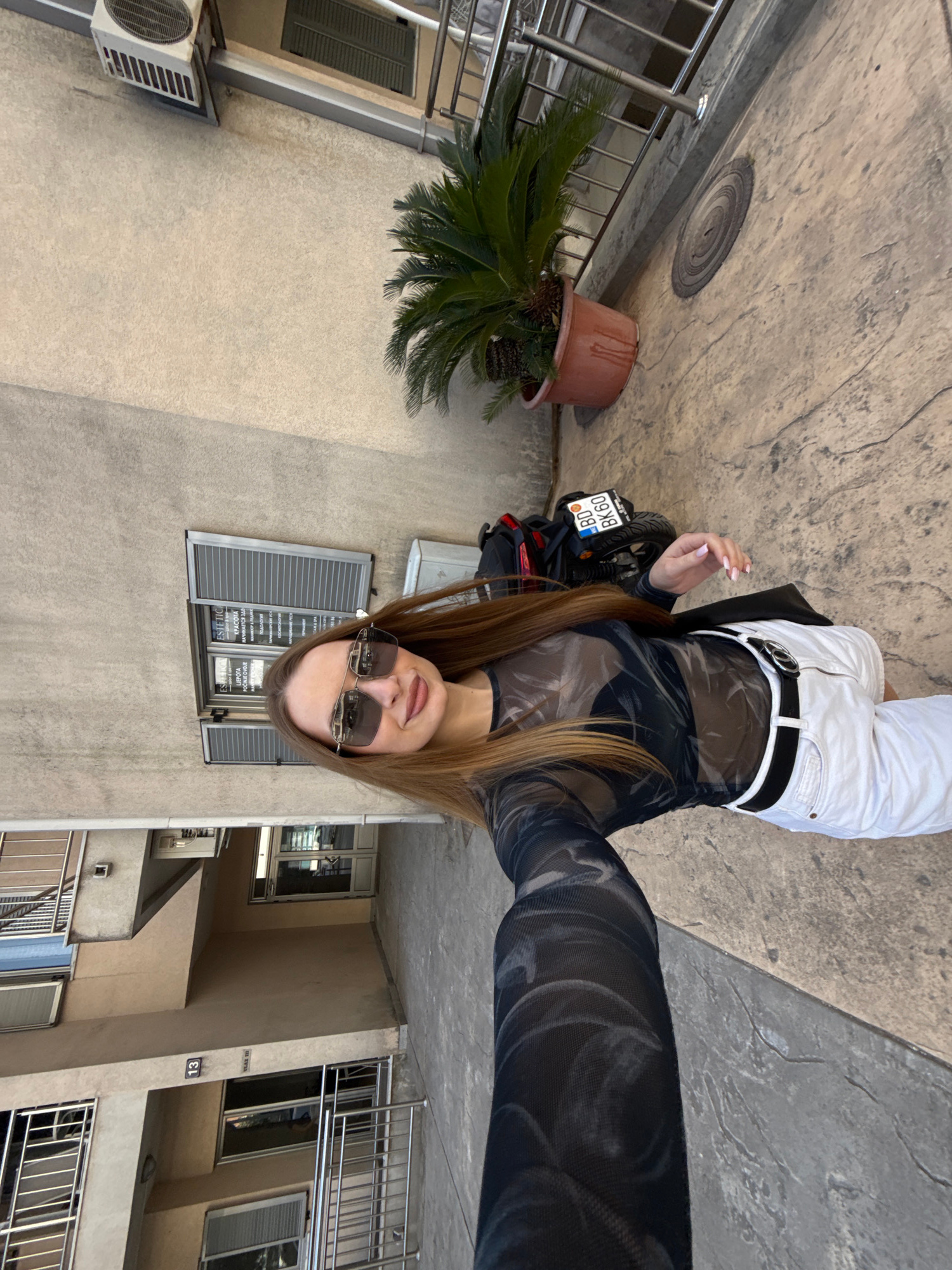 This media file captures a young woman taking a selfie outdoors in a daytime setting, likely in Budva, Montenegro. The image is oriented vertically, with the woman in the foreground and urban surround…read more