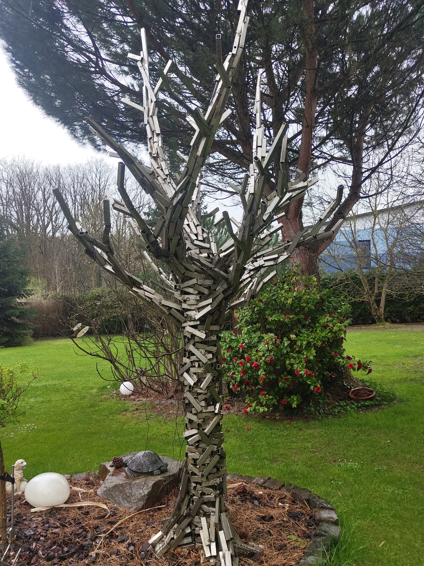 The image depicts a landscaped outdoor scene. The foreground features an artificial tree constructed of metal rectangular tubing, with the appearance of square branches extending outwards. Adjacent to…read more