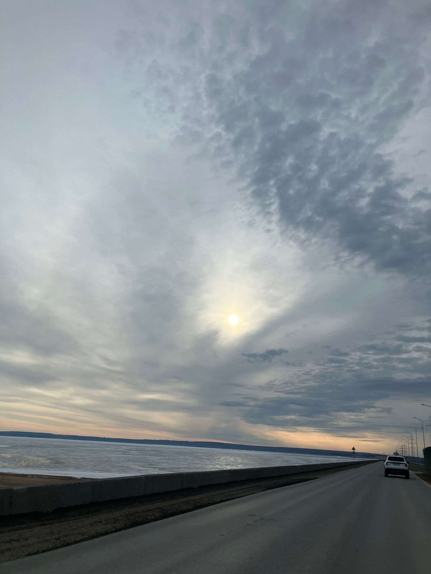 The image depicts a scene in Noviy, Russia, featuring a road running alongside a body of water under a cloudy sky. The sun is visible through a break in the clouds. A car is traveling on the road. The…read more