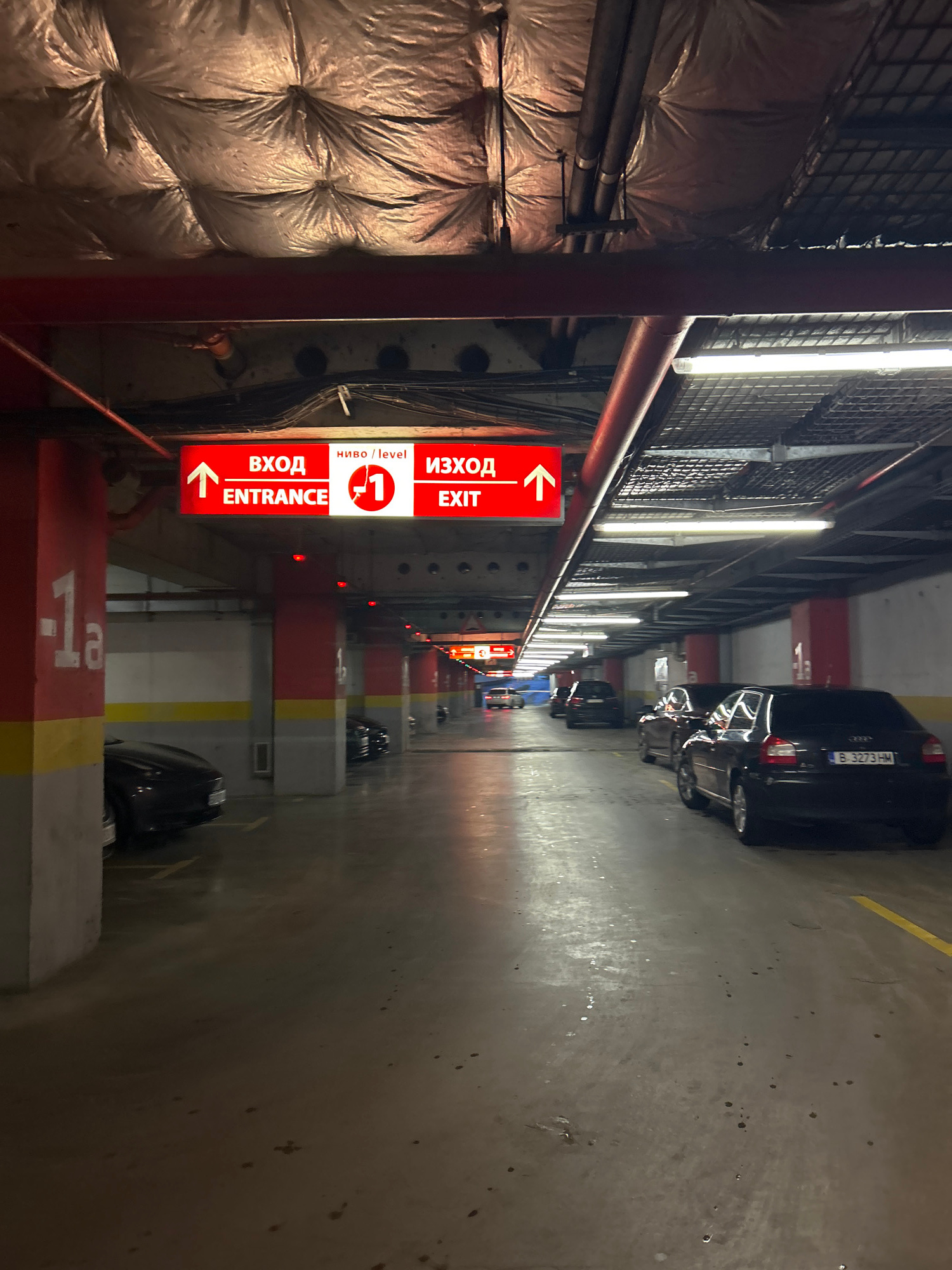 The image depicts an indoor parking garage in Varna, Bulgaria. A red and white sign labeled "Вход Entrance, Ниво/Level 1, Изход Exit" indicates the entrance and exit to the garage's first level. Cars…read more