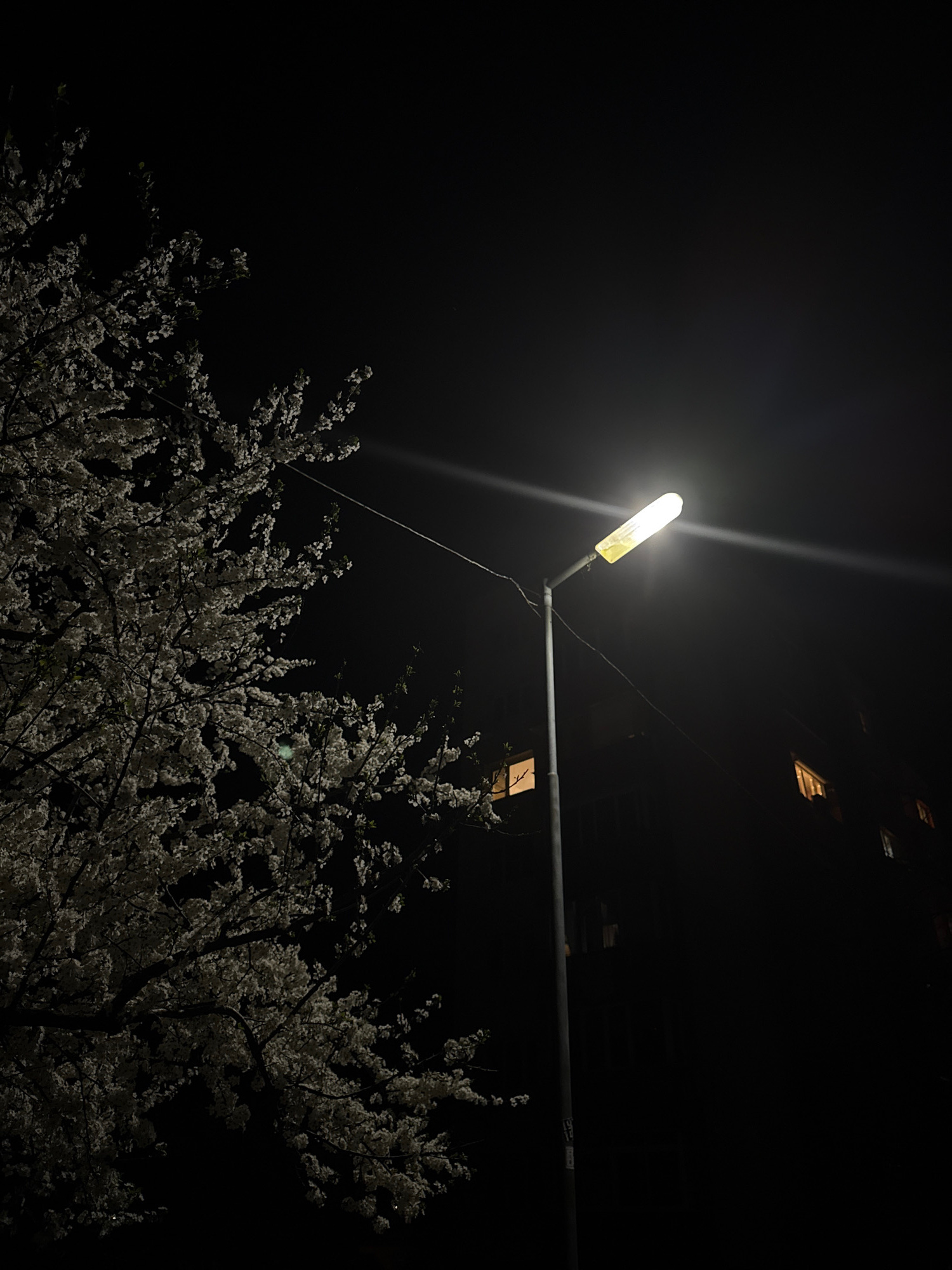 The image shows a night scene in Berkovitsa, Bulgaria. A streetlamp illuminates a tree in bloom. The background is dark, with buildings visible.