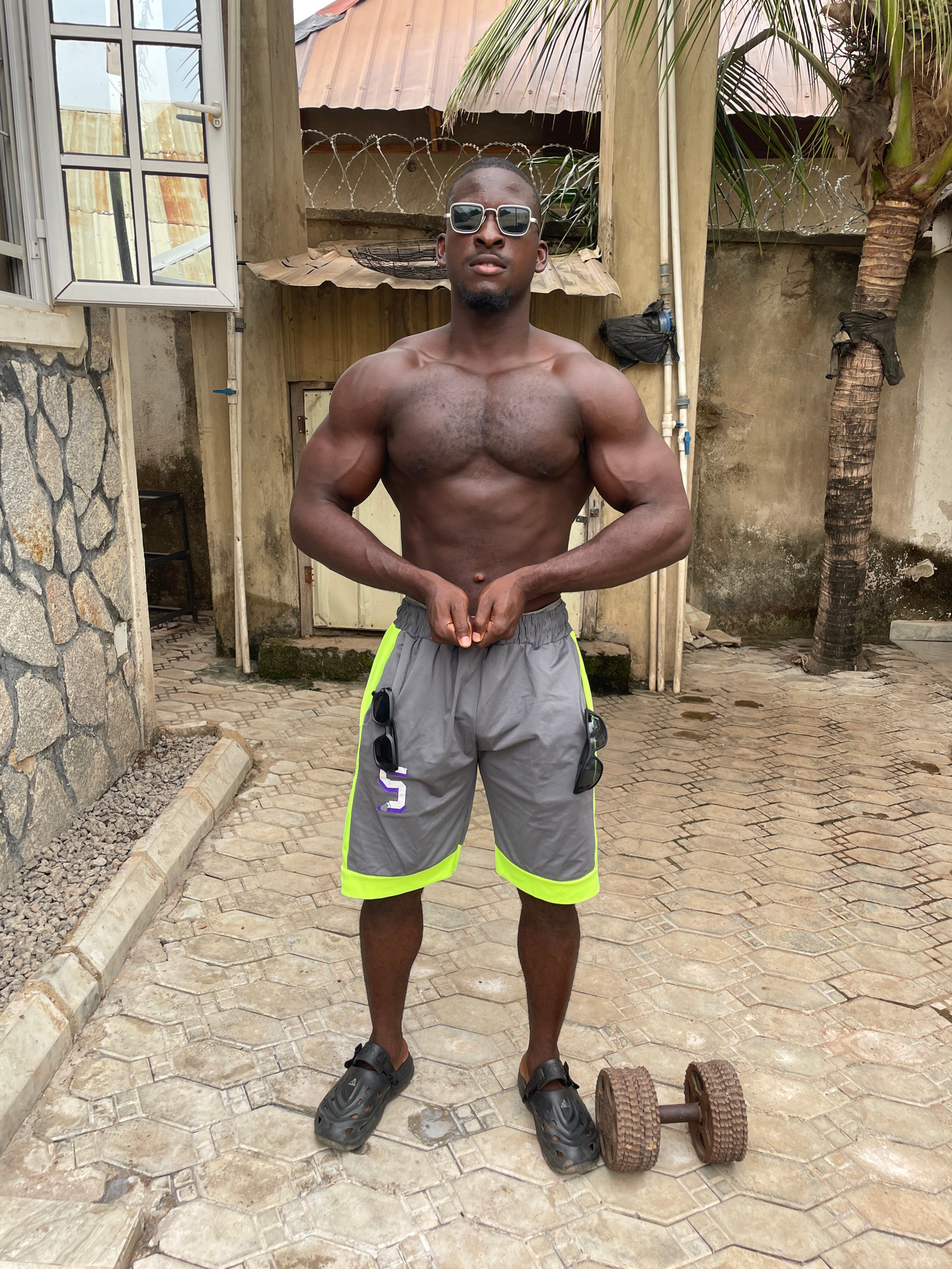 A shirtless, muscular dark-skinned man wearing sunglasses and grey shorts with neon yellow trim stands in a courtyard. He is facing the camera with his hands slightly raised. Behind him is a low build…read more