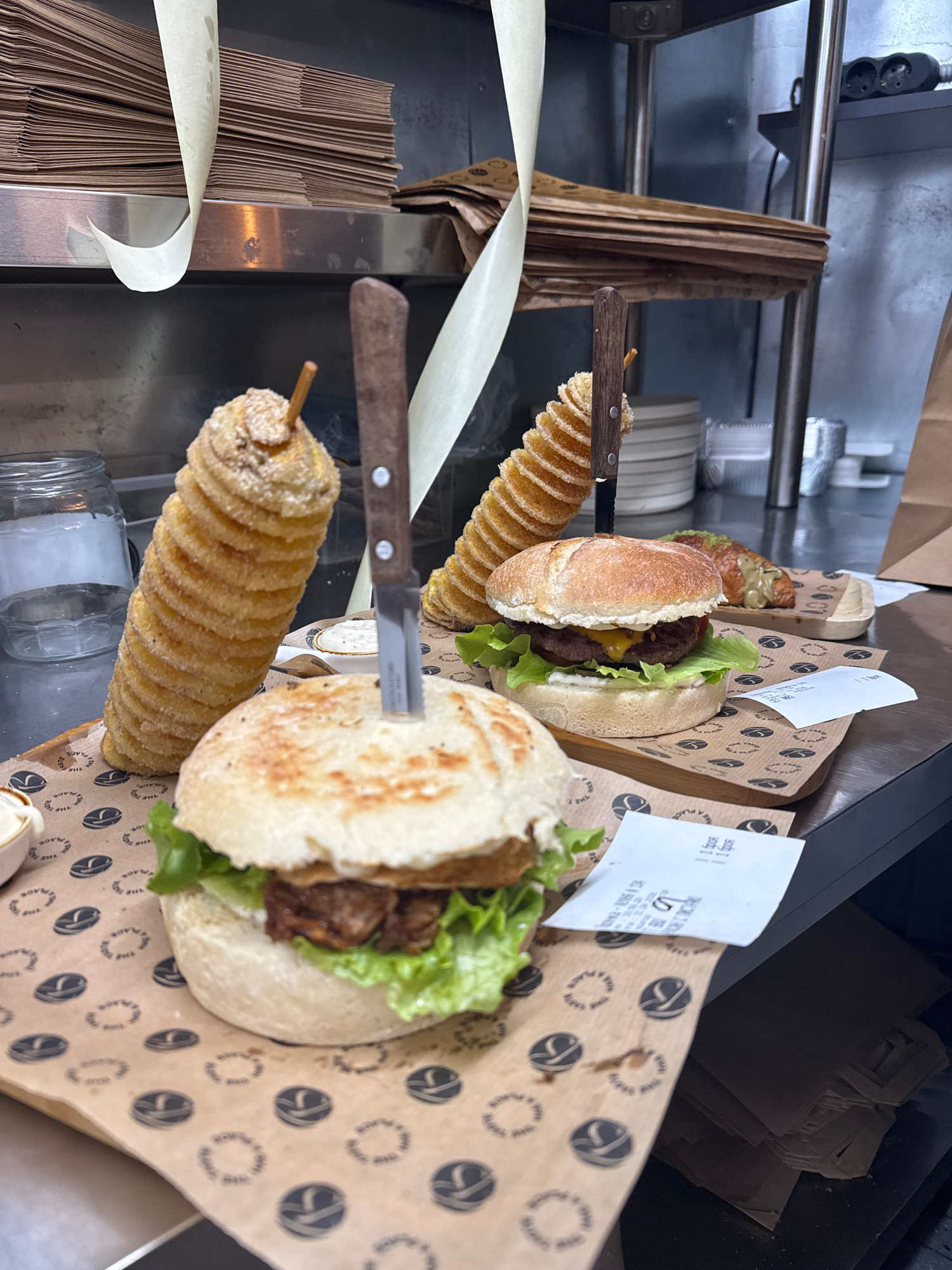 The image depicts a culinary scene in an unidentified city. Two hamburgers, each pierced by a knife, rest on brown paper printed with a circular logo, beside two tornado potatoes, also pierced by kniv…read more