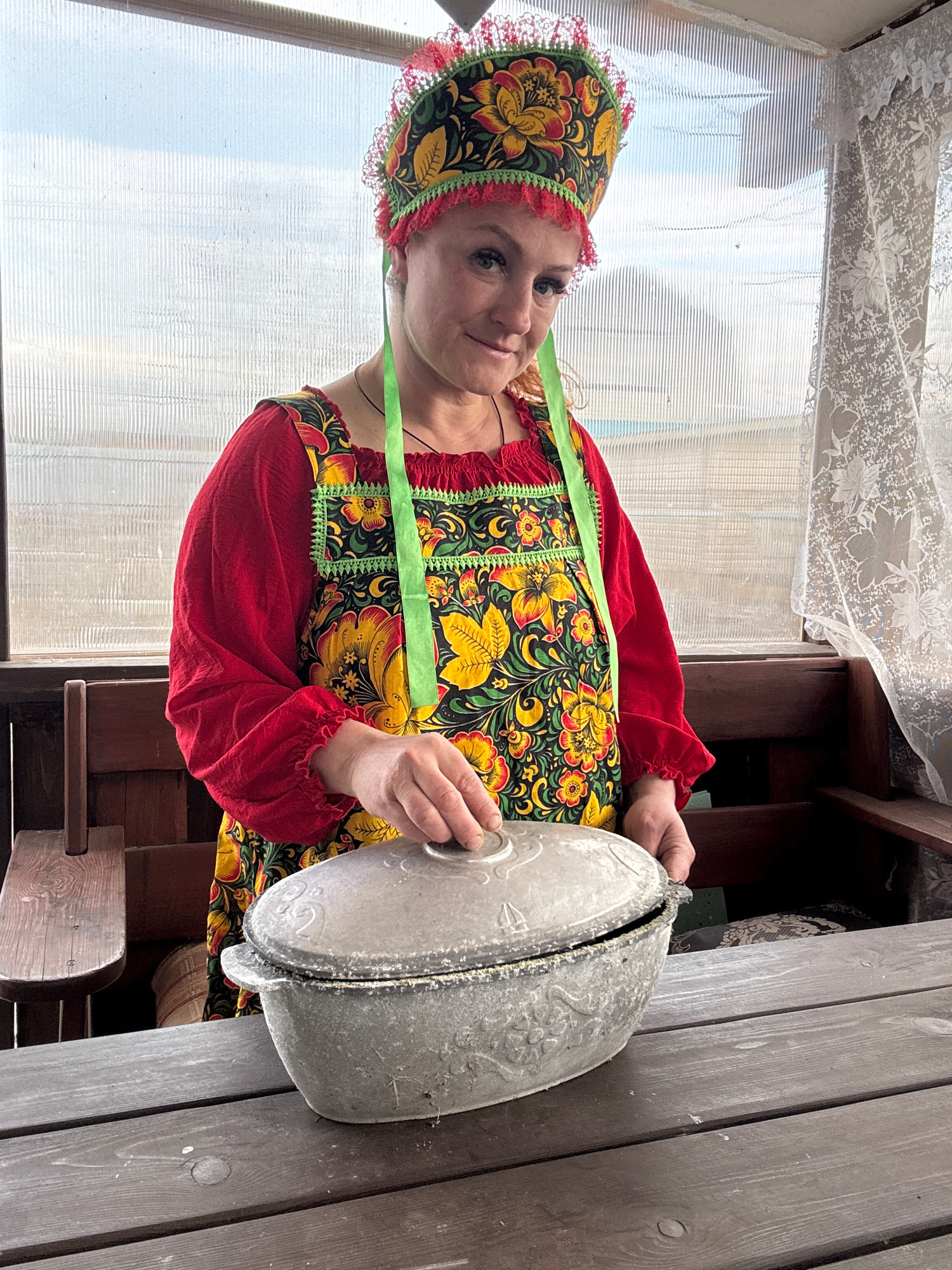 A fair-skinned woman in traditional Russian dress, featuring a red top with matching floral patterns and a green apron, is outdoors, holding a large, dented metal pot with a lid. She's in a room with…read more