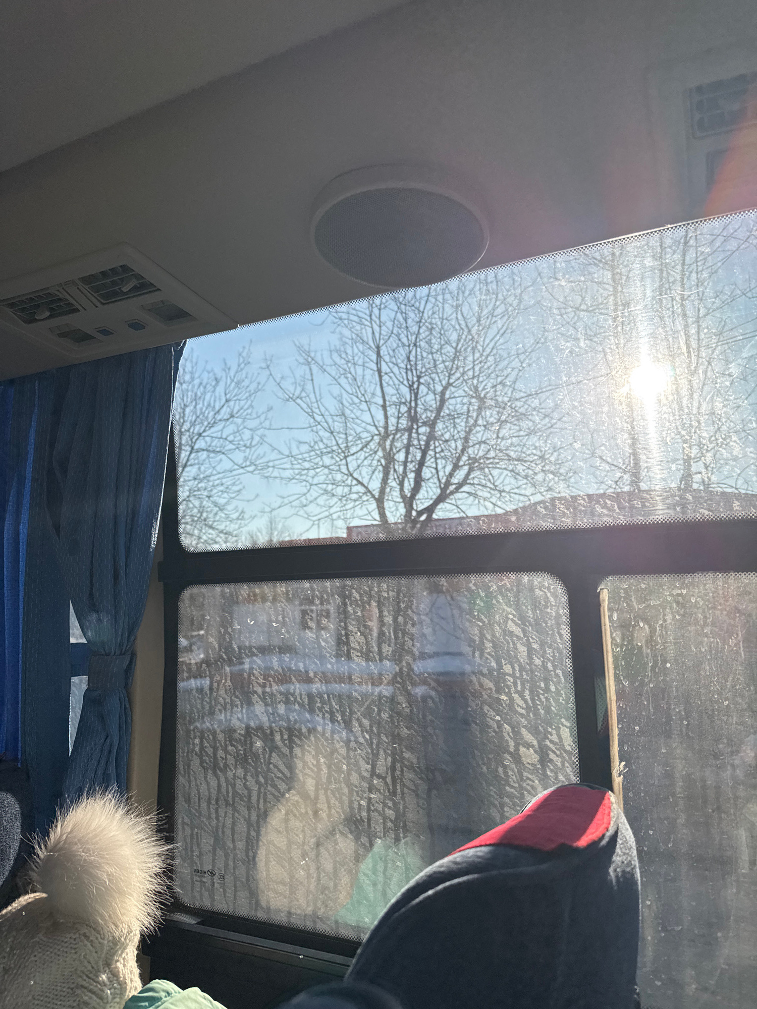 The image is taken from inside a vehicle, likely a bus or van, looking up through a multi-pane sunroof. The panes are separated by black supports. Bare tree branches are visible against a bright, sunn…read more