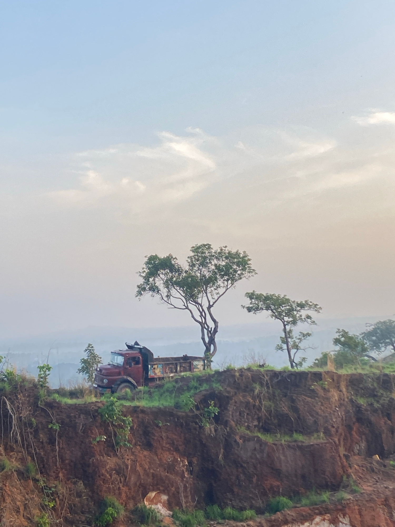 The image depicts a truck parked precariously close to the edge of a cliff. The cliff is composed of reddish-brown soil and rock. There is some green vegetation growing on the cliff face. A tree grows…read more