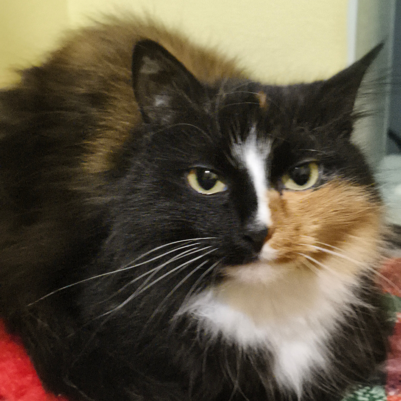 A close-up portrait captures a long-haired calico cat indoors, in Chaikovsky, Russia. The cat's fur features distinct patches of black, orange/tan, and white, with a prominent white stripe bisecting i…read more