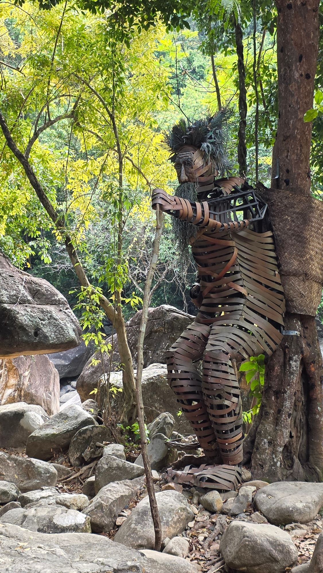 The image shows an outdoor scene featuring a metal sculpture of a human-like figure with a woven basket-like structure above it. The sculpture appears to be integrated into the natural environment, resting on a large tree root and amongst large rocks. The vegetation includes green and yellow-leaved trees. The location is inferred to be in Nam Ninh Hoa, Vietnam, based on the prompt. There are no people visible in the image. | Open Wire