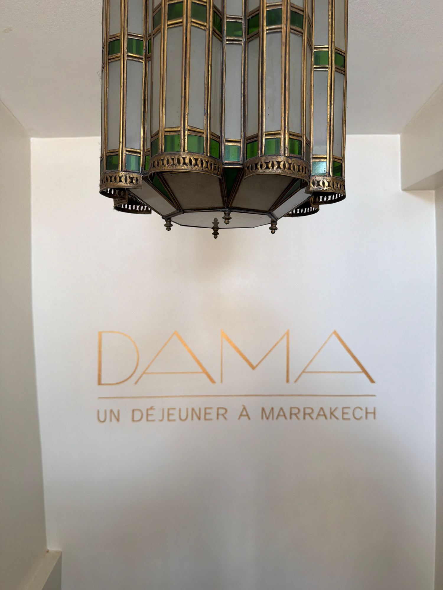 An upward shot shows a hanging, octagonal-shaped chandelier with a white and green glass design and gold trim. To the right of the chandelier is a white wall that has golden lettering that reads "DAMA…read more