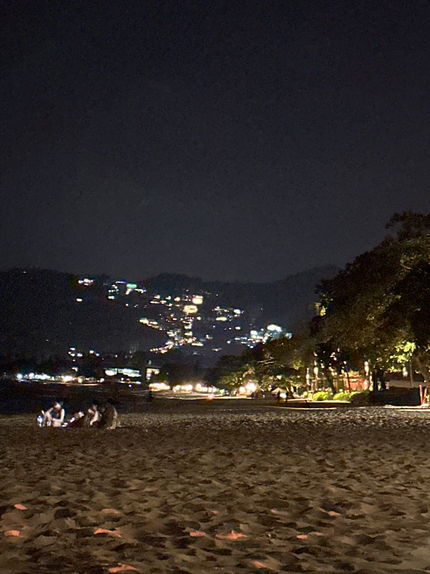 At night, the image presents a view from what appears to be a beach in Baan Chaweng, Thailand. The dark water and sky fill the left half of the image, partially obscured by a mountain range dotted witβ¦read more