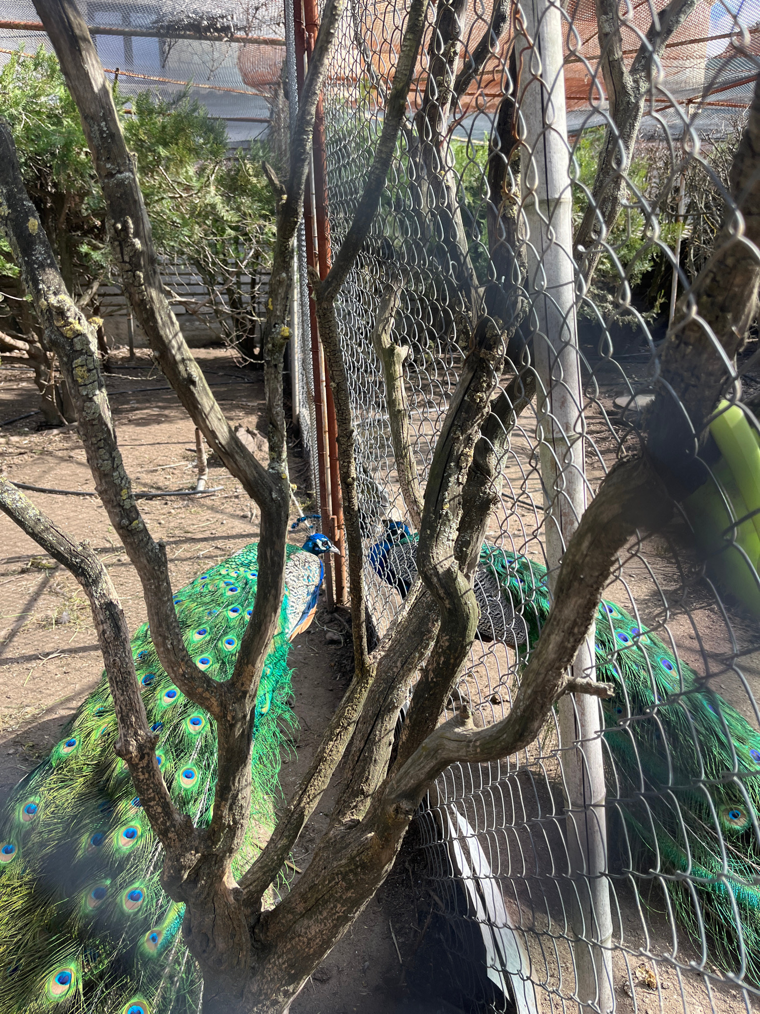 The image, taken from an elevated perspective, depicts a scene inside a fenced enclosure in General Todorov, Bulgaria. Two peacocks are visible. One is displaying its vibrant, iridescent green and blu…read more