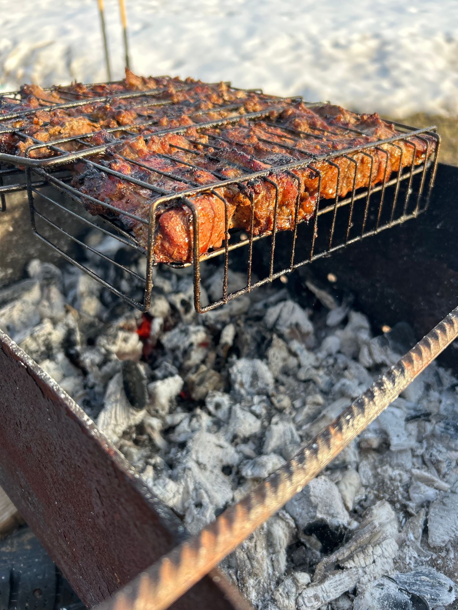 The image displays a close-up perspective of meat being grilled outdoors in the city of Noviy, Russia. A rectangular wire metal grilling basket, containing numerous pieces of reddish-brown meat with vā¦read more