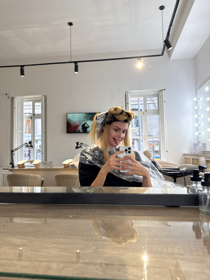 A female individual is captured in a selfie reflected in a mirror within a brightly lit hair and nail salon, located in Tbilisi, Georgia. The specific street location within Tbilisi is not discernible…read more