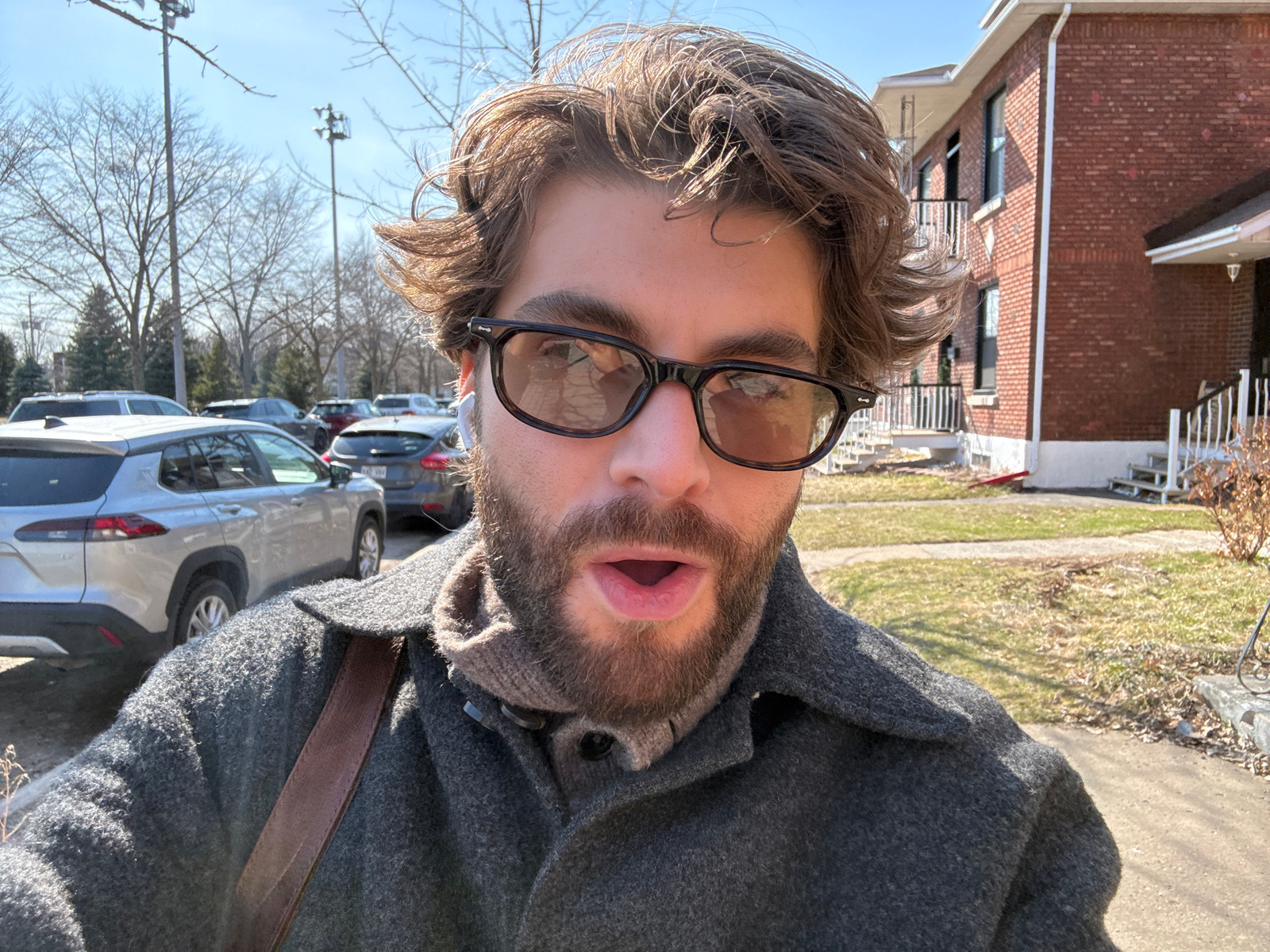 A close-up selfie of a person with brown hair, a beard, and glasses, wearing a gray coat and a brown strap across the chest. The background includes a brick building, a street, parked cars, and trees.…read more