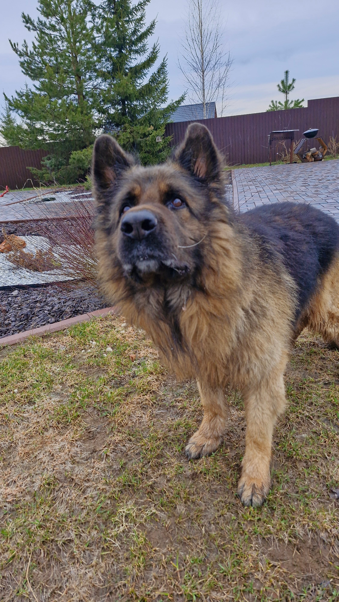 A brown and black long-haired dog is lying on a patch of grass. The dog's head is close to the camera, and it appears to be looking directly at the viewer. Behind the dog, a border of rocks and mulchβ¦read more