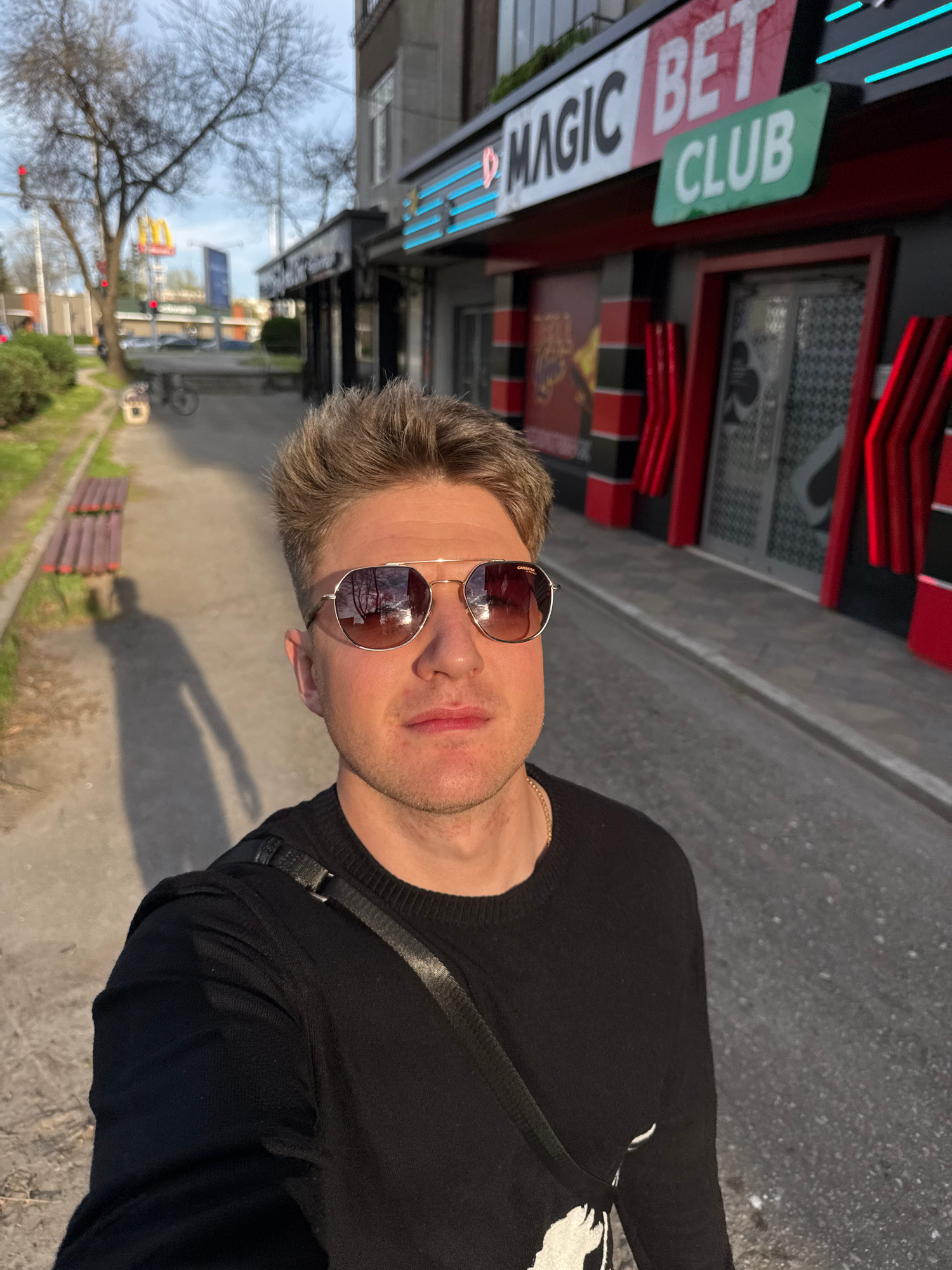 A man wearing sunglasses and a black sweater stands on a sidewalk next to a building bearing the sign "MAGIC BET CLUB." Behind him, the streetscape features a sidewalk, some green vegetation, benches,…read more
