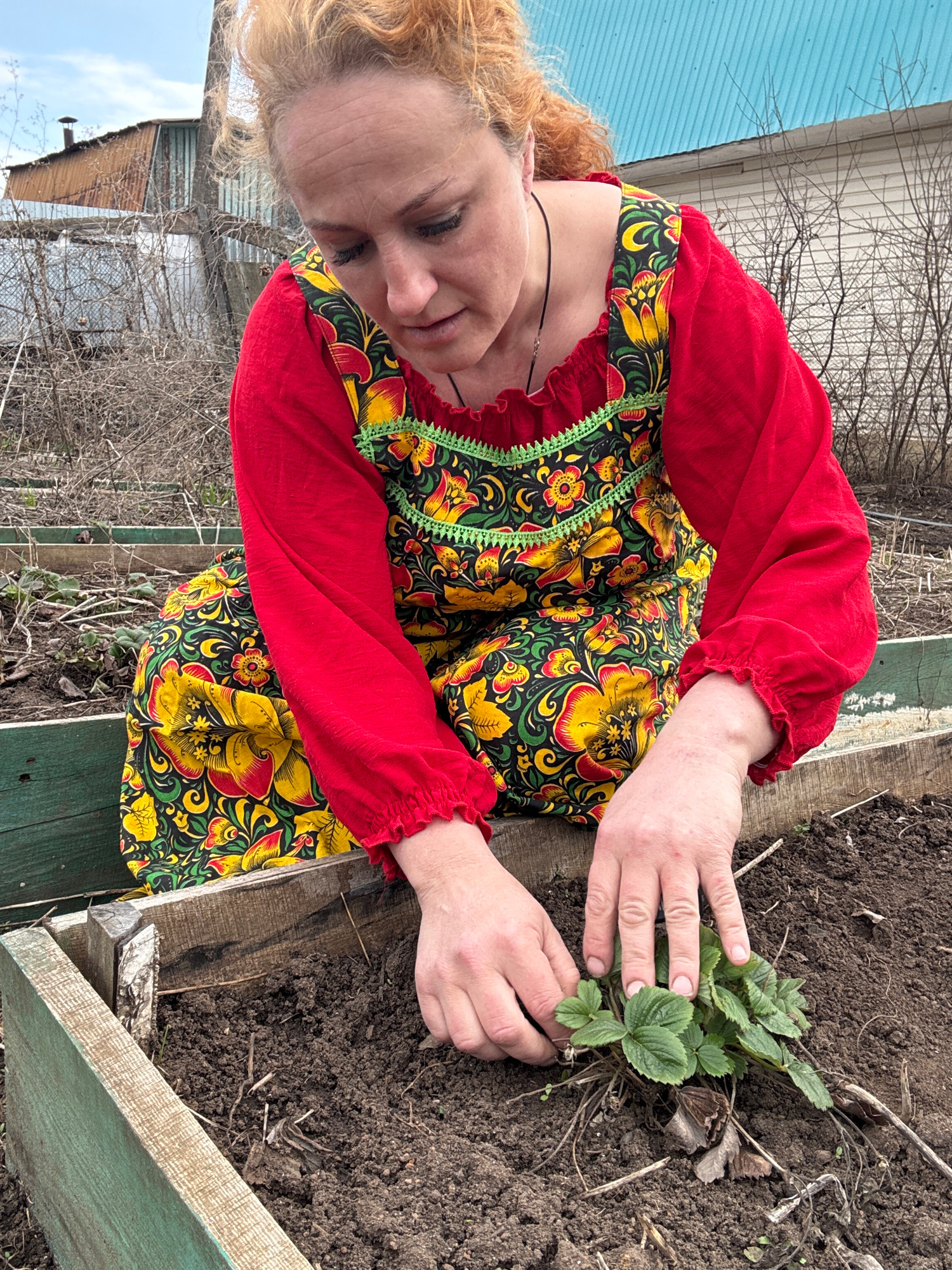 The image depicts a woman in a traditional Russian dress tending to a plant in a raised garden bed. The woman has light skin and curly hair, and she is wearing a dress with red sleeves and a colorful…read more