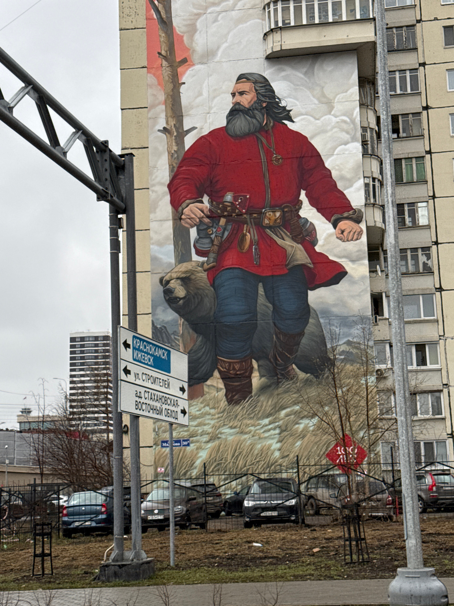 The image shows a mural of a bearded man in a red coat riding a bear, painted on the side of a building. A street sign in the foreground points to "Krasnokamsk Izhevsk," "ul. Stroyitelei," and "ad. St…read more