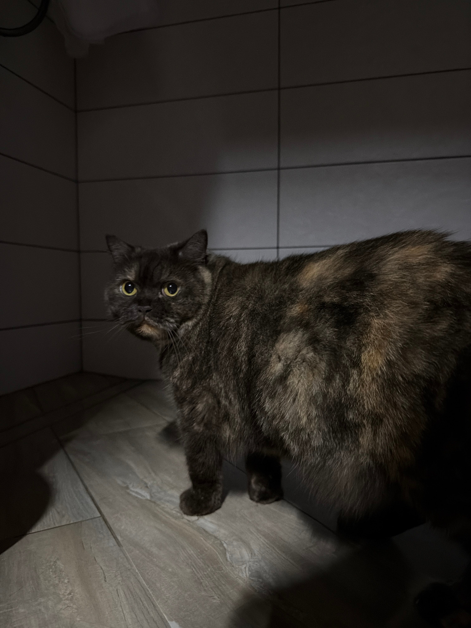 A tortoiseshell cat lies on grey tiled flooring in a dim room. The cat's head is tilted, and it gazes upwards with wide yellow eyes. The surrounding environment consists of tiled walls and floors, sug…read more