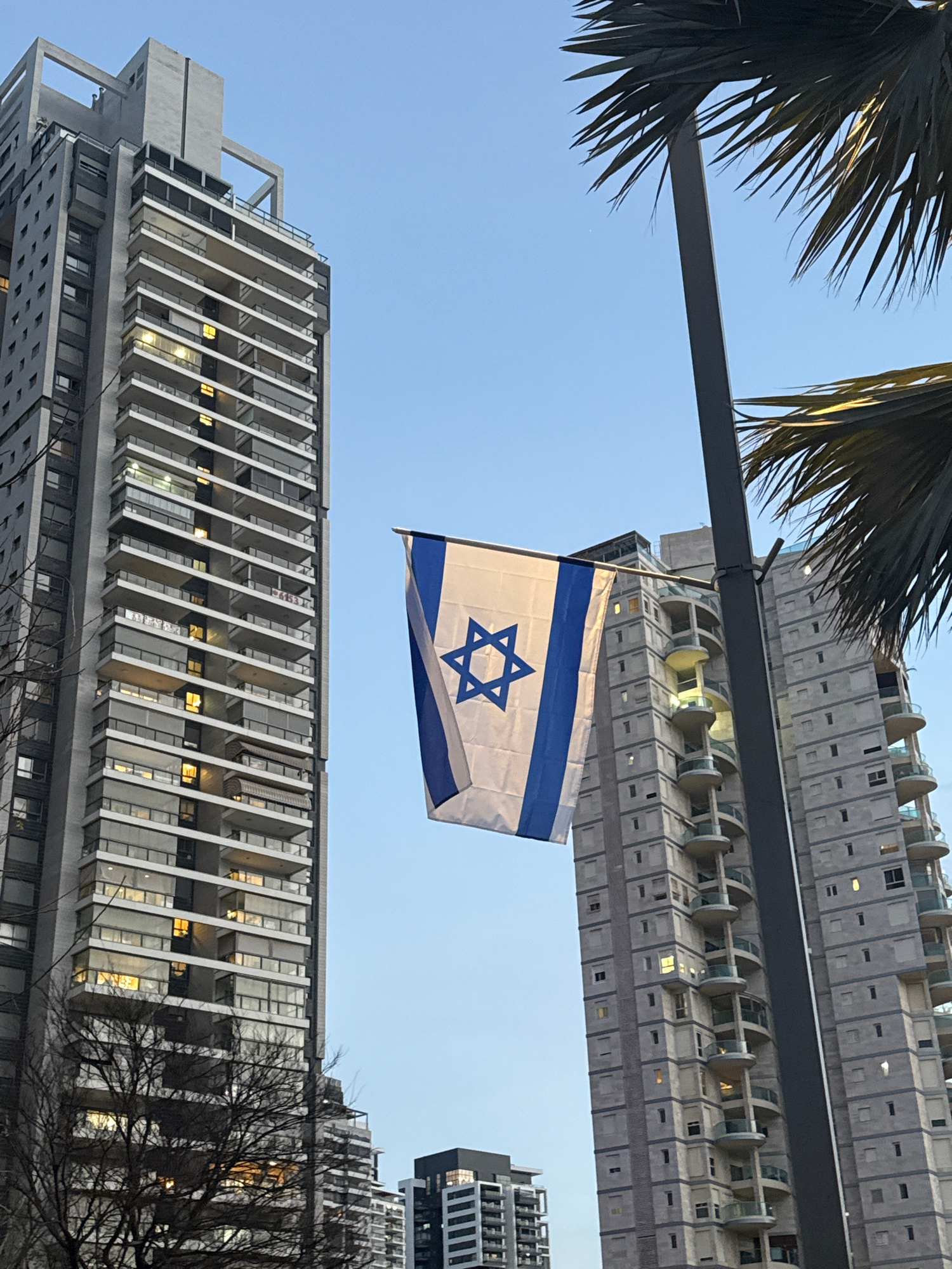 The image depicts the flag of Israel waving against a backdrop of buildings in Bat Yam, Israel. A palm tree is visible on the left. The buildings are of modern architectural design, with one featuring…read more