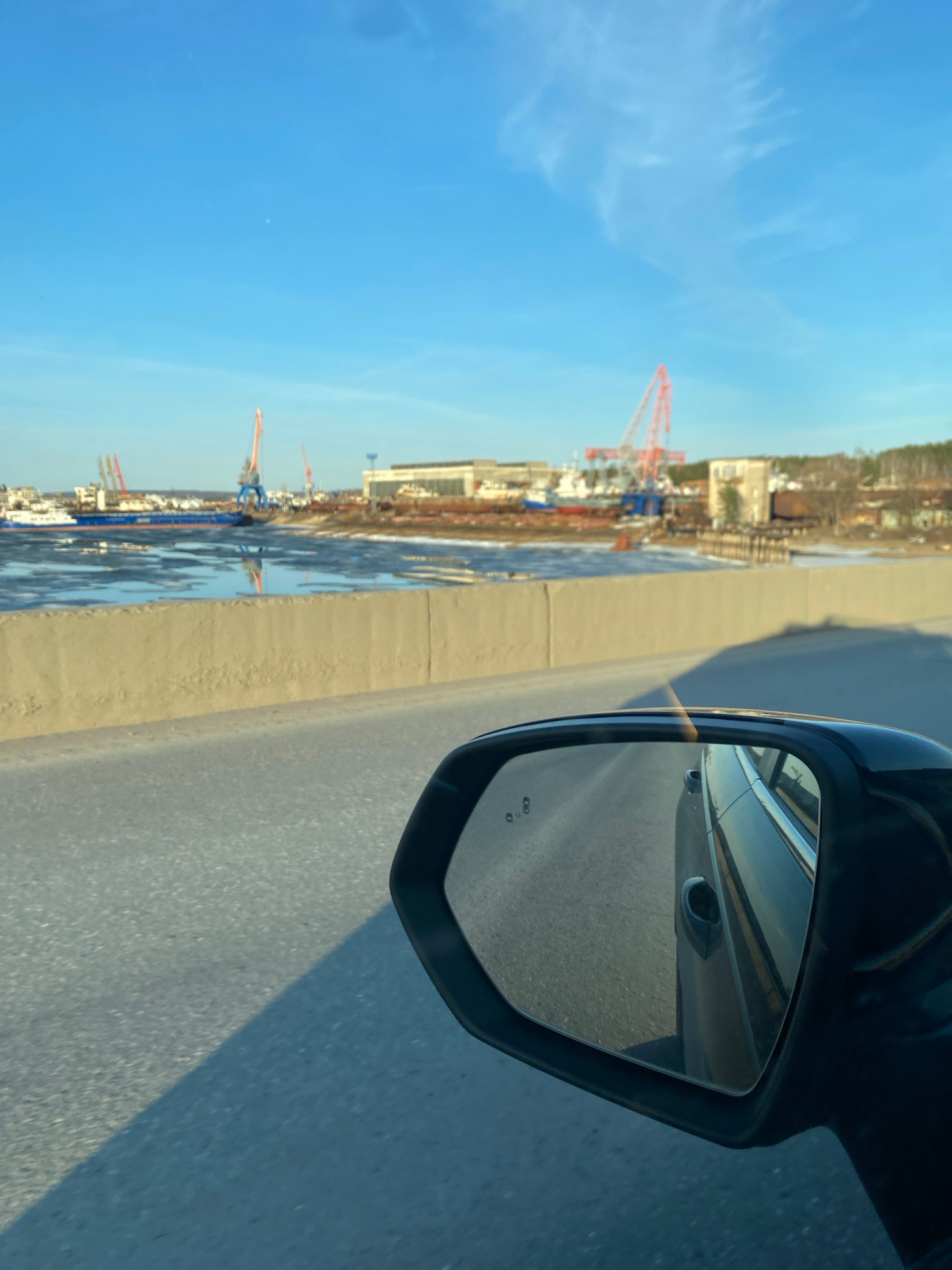 The image, taken from a moving vehicle, captures a bright daytime scene along a waterway in Chaikovsky, Russia. In the foreground, the black side mirror of a car occupies the right side of the frame.…read more