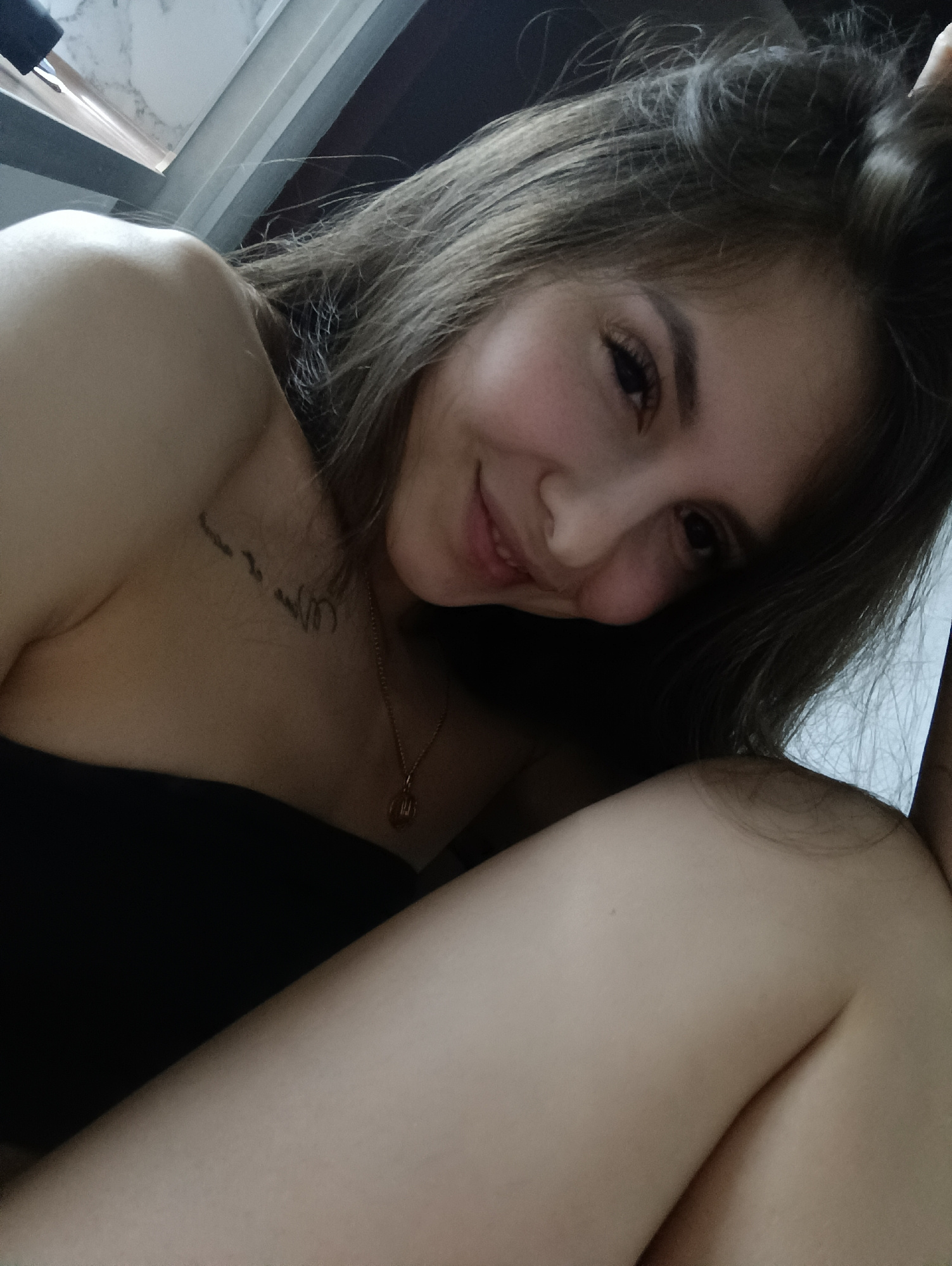 The image shows a young woman with brown hair smiling at the camera. She's wearing a black strapless top and a gold necklace with a small pendant. There is a tattoo visible on her upper chest. The bac…read more