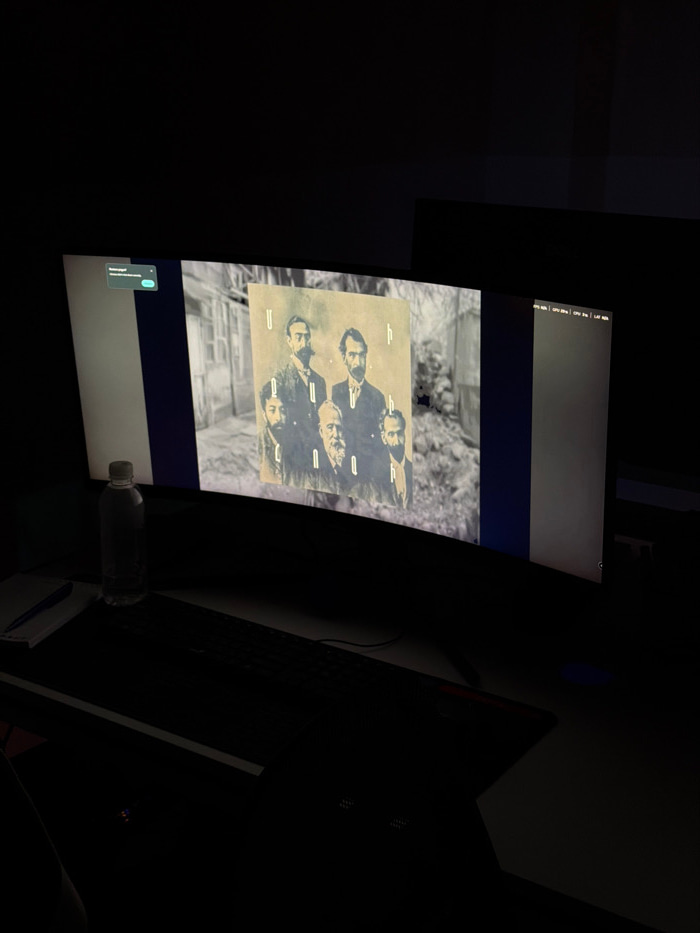 A dark room features a large monitor displaying an image of a black and white photo superimposed on a grayscale background. The photo shows four men in suits, with text boxes near each person. The mon…read more