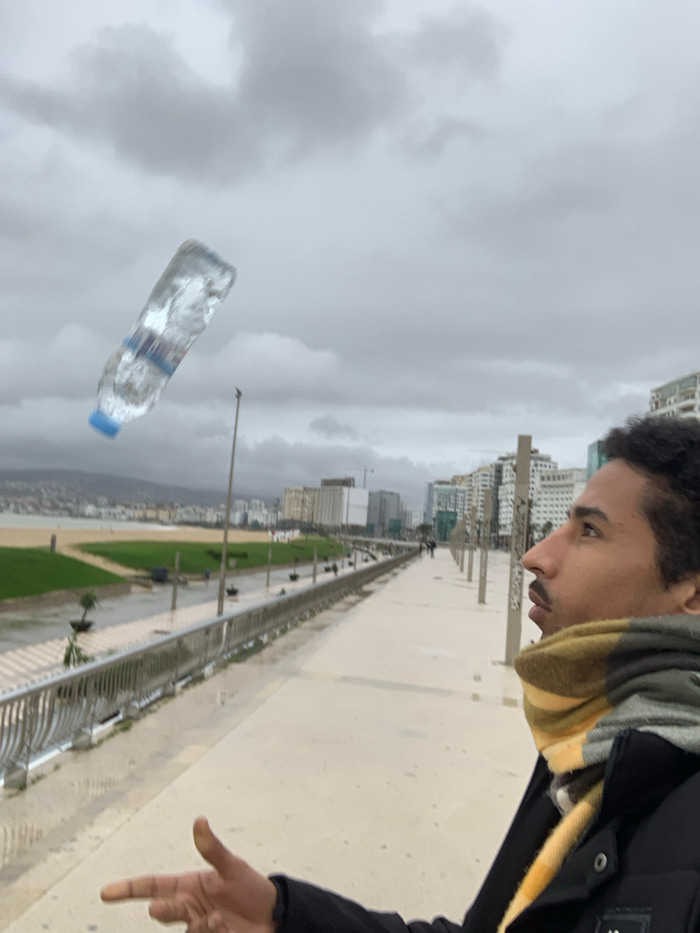 The image, originally oriented vertically but best viewed rotated clockwise by 90 degrees, depicts a man interacting with a floating water bottle on an overcast day in what appears to be a modern coasβ¦read more