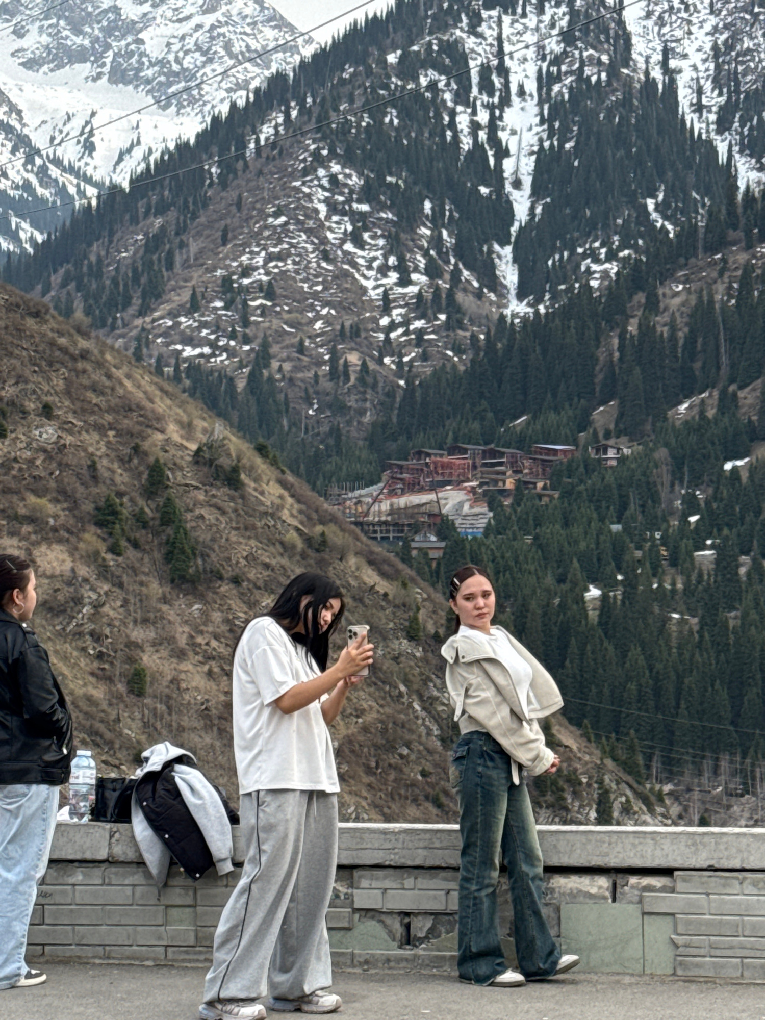 The image displays three individuals on a paved platform or walkway, overlooking a vast mountainous landscape in Almaty, Kazakhstan. The scene suggests a mountain resort or scenic overlook, with pine…read more