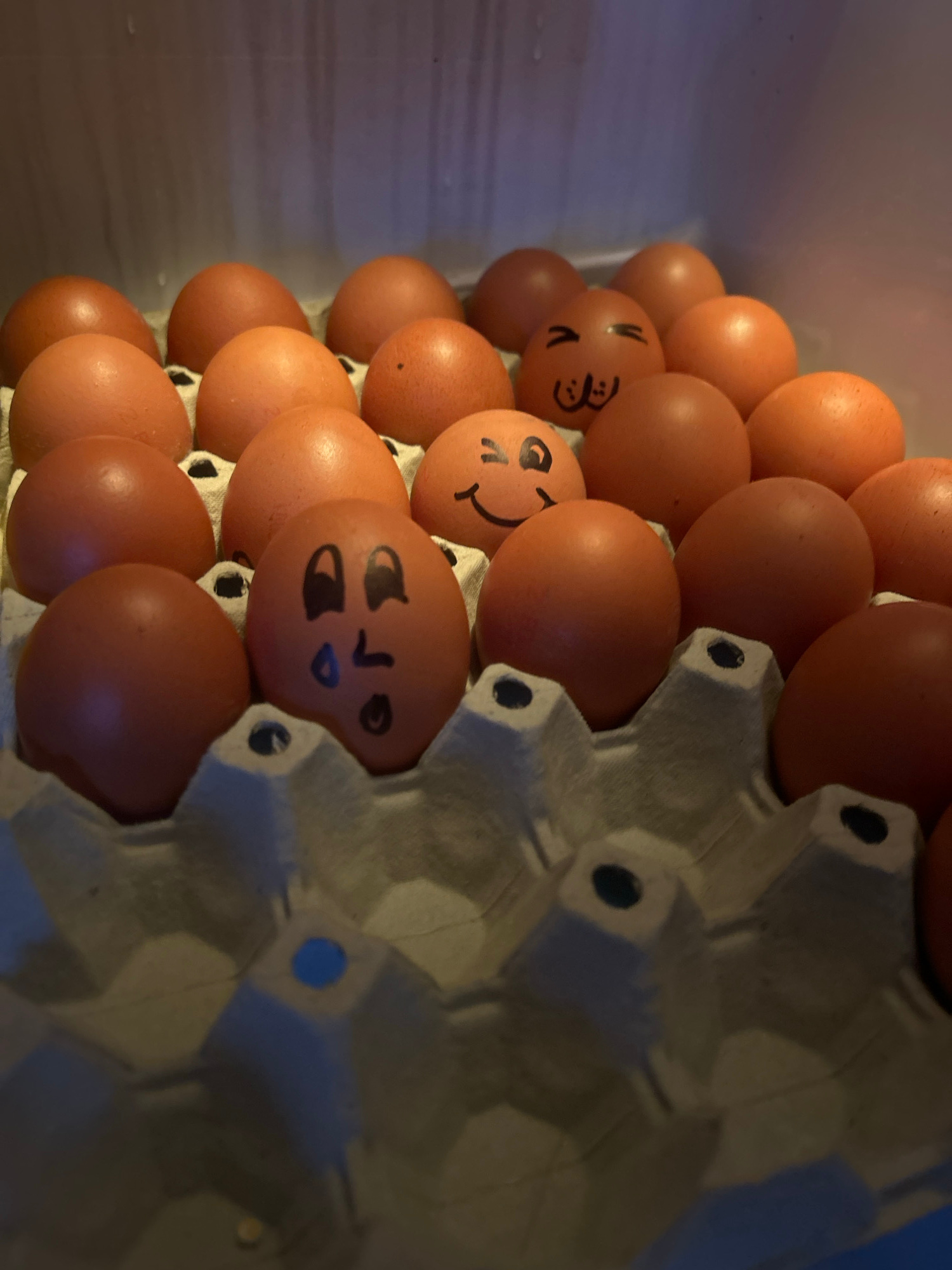 A close-up shot features a carton of brown eggs. Some eggs have drawn-on faces. The carton is made of gray cardboard with molded compartments. The image is brightly lit. The scene is located in Unknow…read more